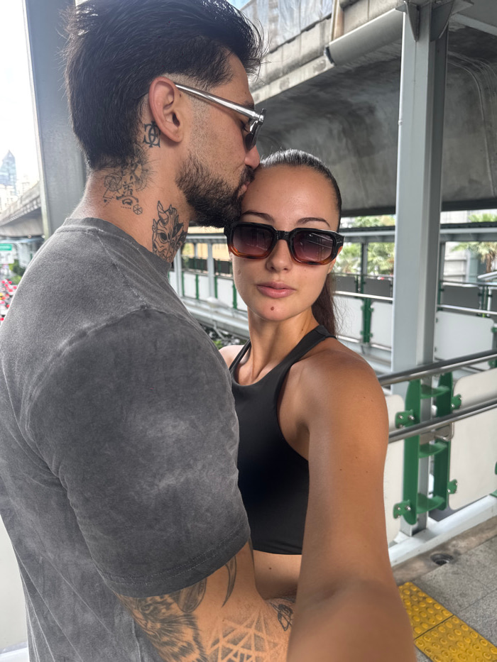 The image displays two individuals on an elevated platform, identified as a Bangkok BTS Skytrain station based on the distinct elevated concrete structure, metal railings with green and white panels,…read more