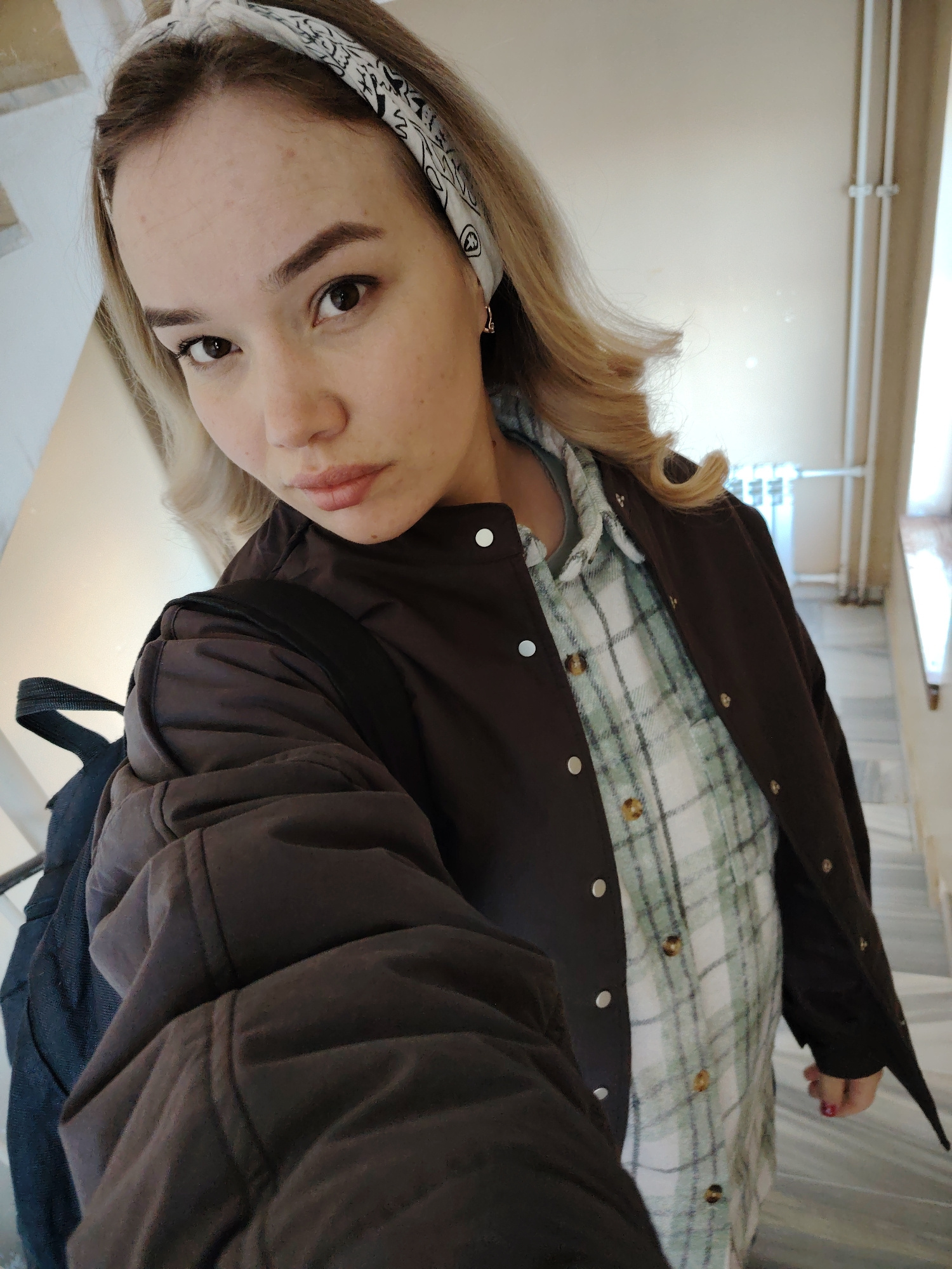 A young woman takes a selfie while standing on a marble staircase. She has fair skin, light brown eyebrows, and dark eyes, and her blonde hair is styled with a curl and a bandana. She wears a light gr…read more