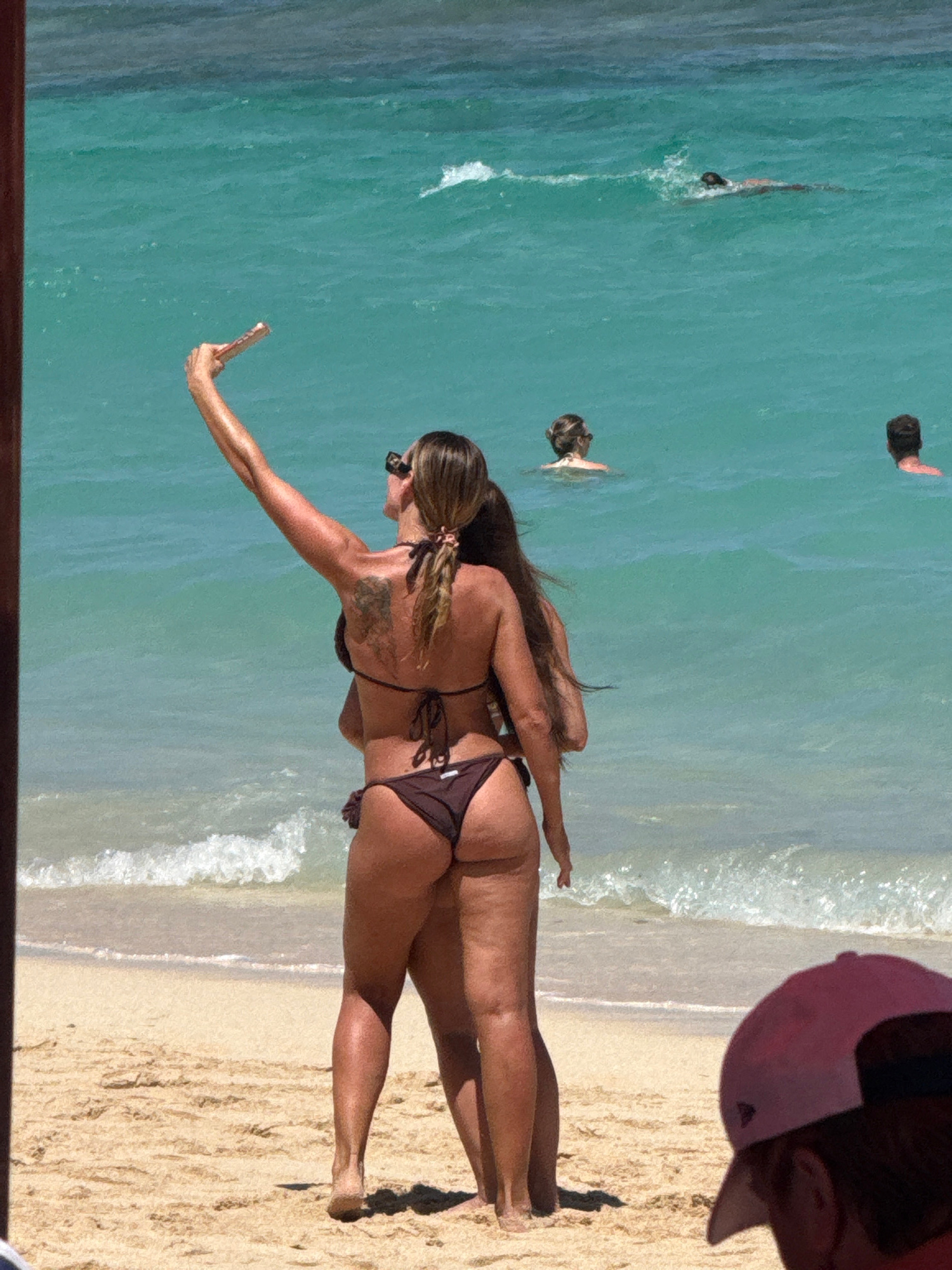 The image shows a beach scene, likely in Kuta Selatan, Indonesia, based on the landscape. A woman in a brown bikini stands on the sandy beach facing the turquoise ocean, holding a phone out as if taki…read more
