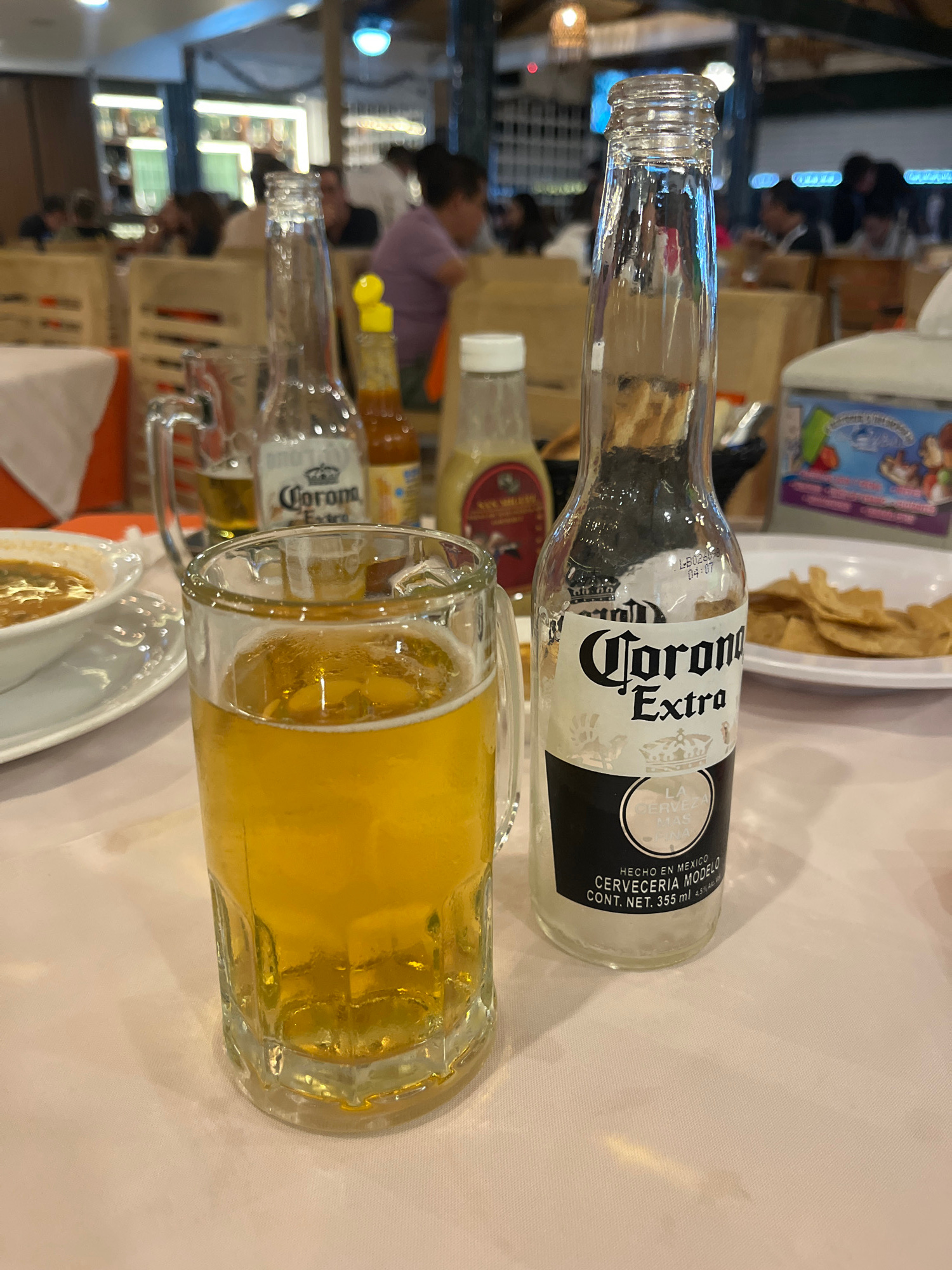 The scene depicts a table with an empty bottle of Corona Extra beer and a glass mug filled with light-colored beer. The Corona bottle is positioned horizontally on the table, with the label clearly vi…read more