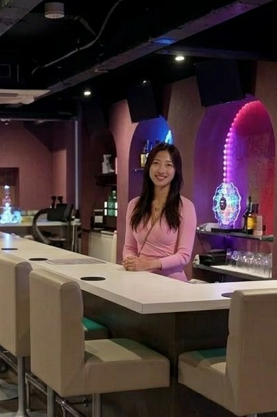 An adult East Asian female is depicted standing behind a white bar counter in an indoor commercial establishment. She has long, dark hair, is smiling, and is looking directly at the camera. She is wea…read more