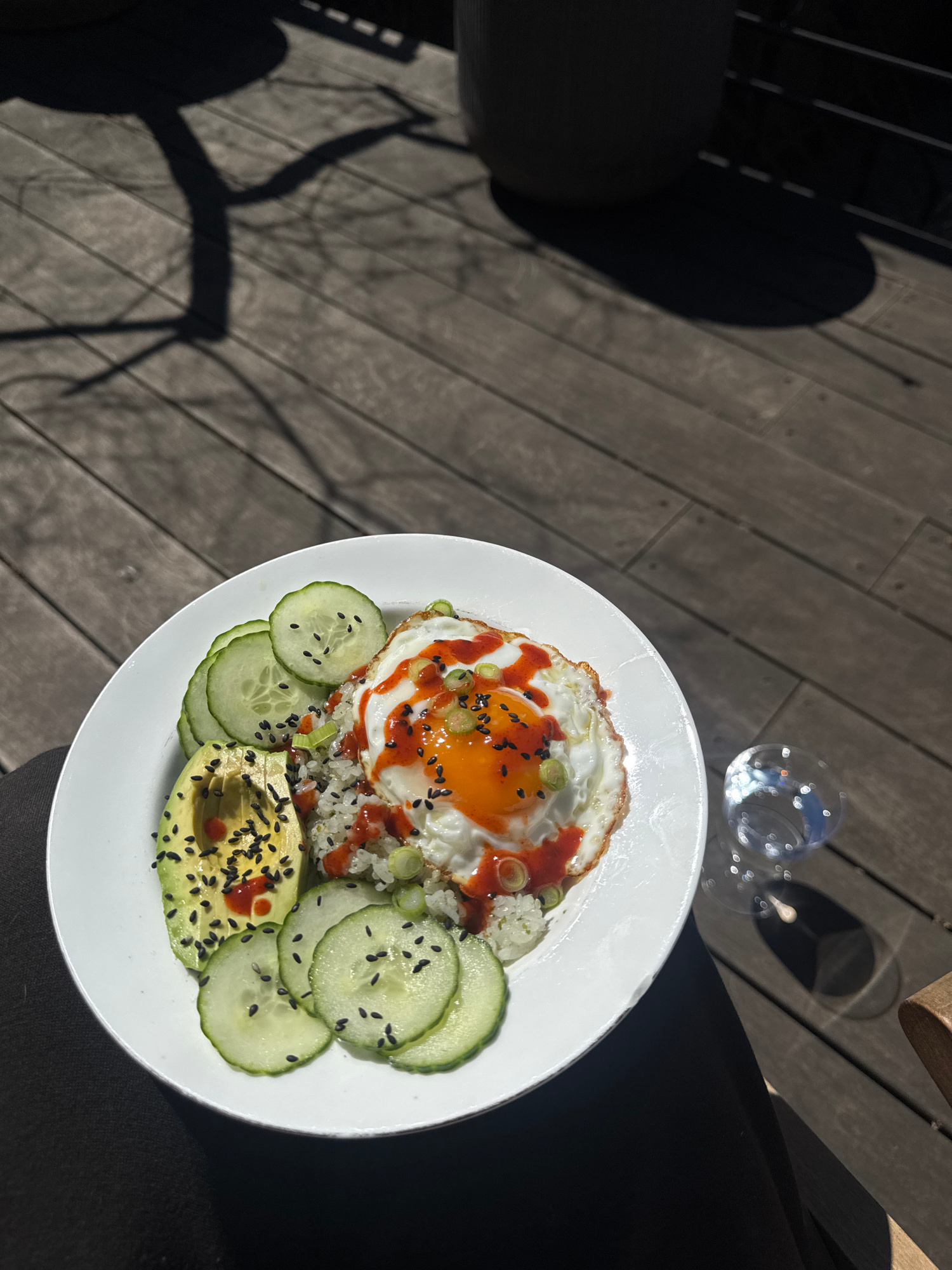 A top-down, eye-level shot shows a white plate of food on a weathered wooden surface. The food consists of rice topped with a fried egg drizzled with a red sauce and sprinkled with black sesame seeds…read more