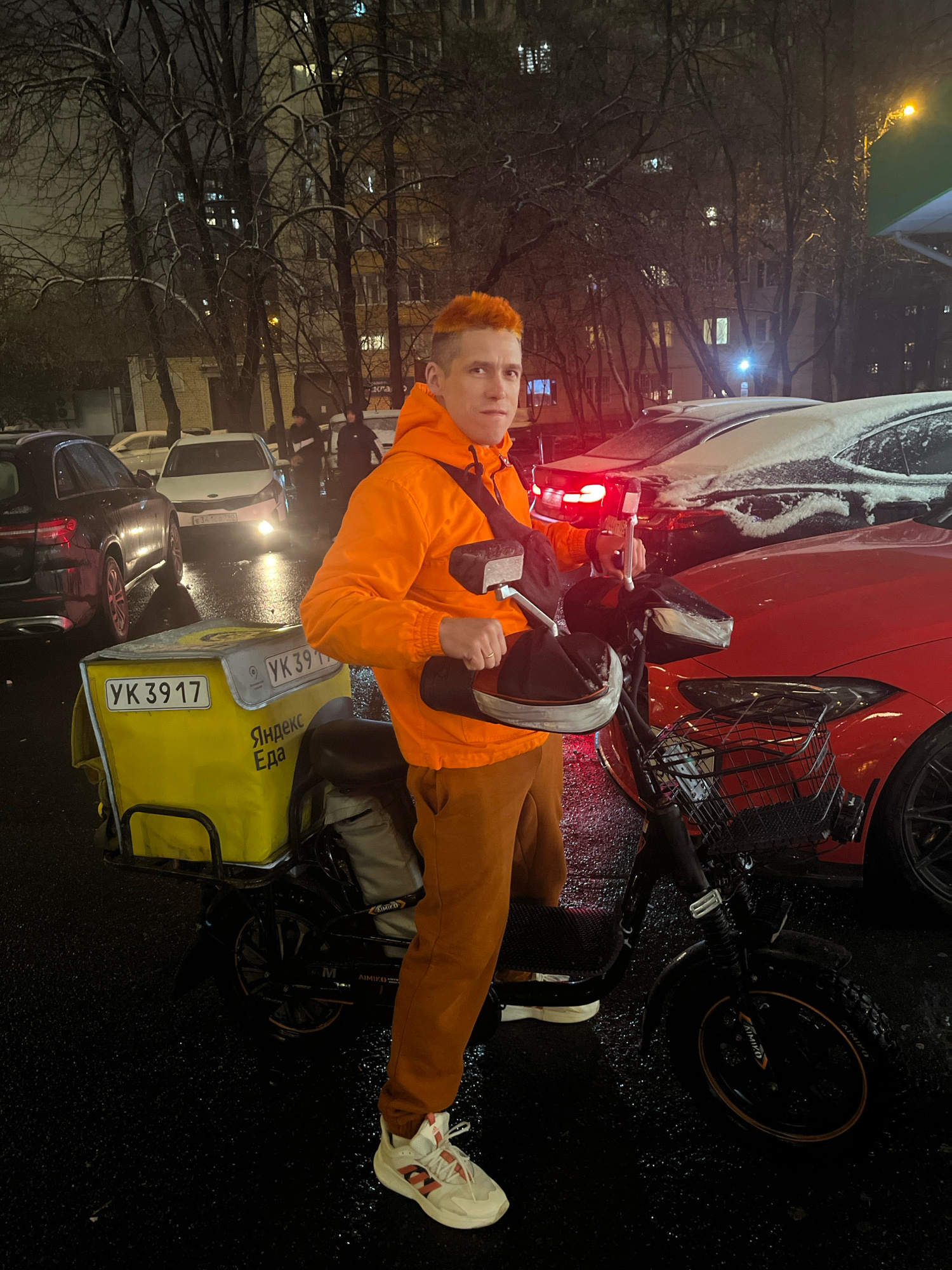 A person with orange hair is standing next to an electric bike with a yellow Яндекc Eда delivery bag on the back. The license plate on the bag reads "УК 3917". The person is wearing an orange jacket a…read more