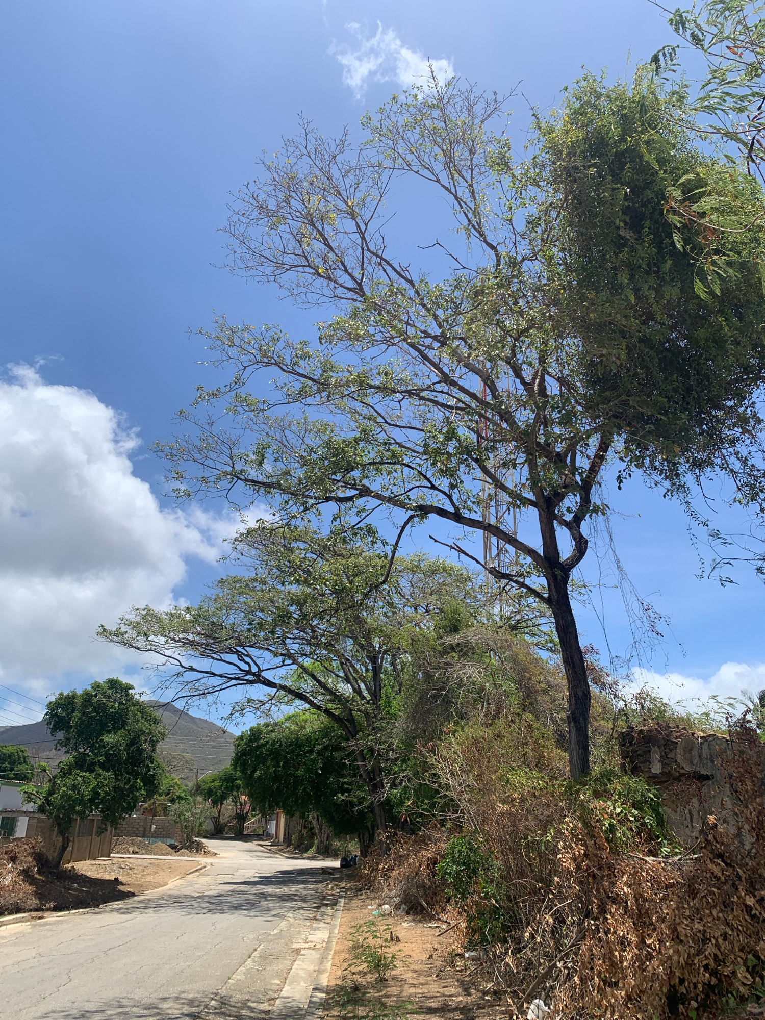 The image depicts a street scene in Santa Ana, Venezuela, with a focus on the natural surroundings. A paved road winds through the landscape, lined by trees on either side. One dominant tree in the fo…read more