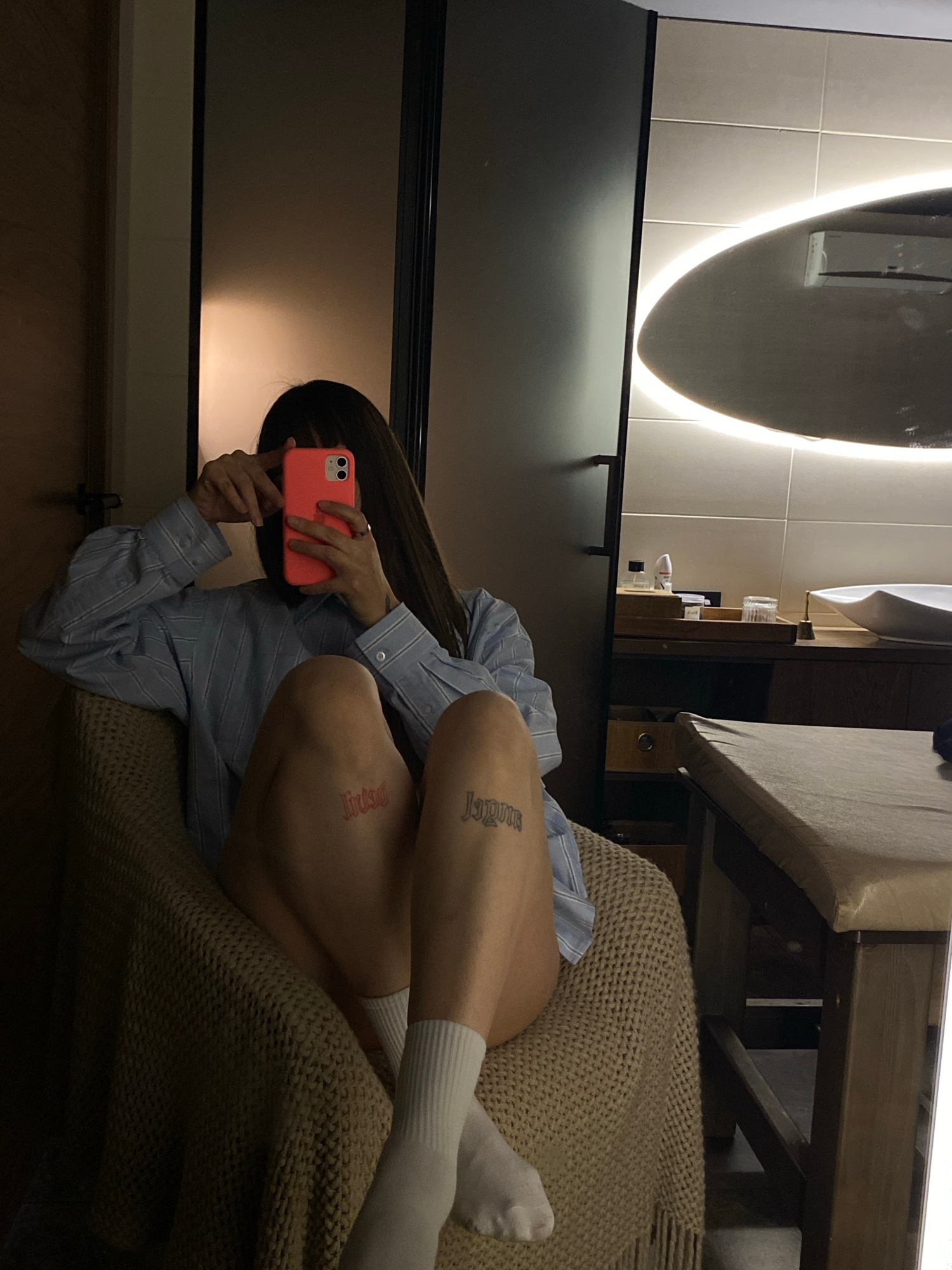 The image depicts a person reclining indoors, appearing to take a selfie in a mirror or reflective surface. The entire image is rotated 90 degrees clockwise. The subject, likely female, is visible fro…read more