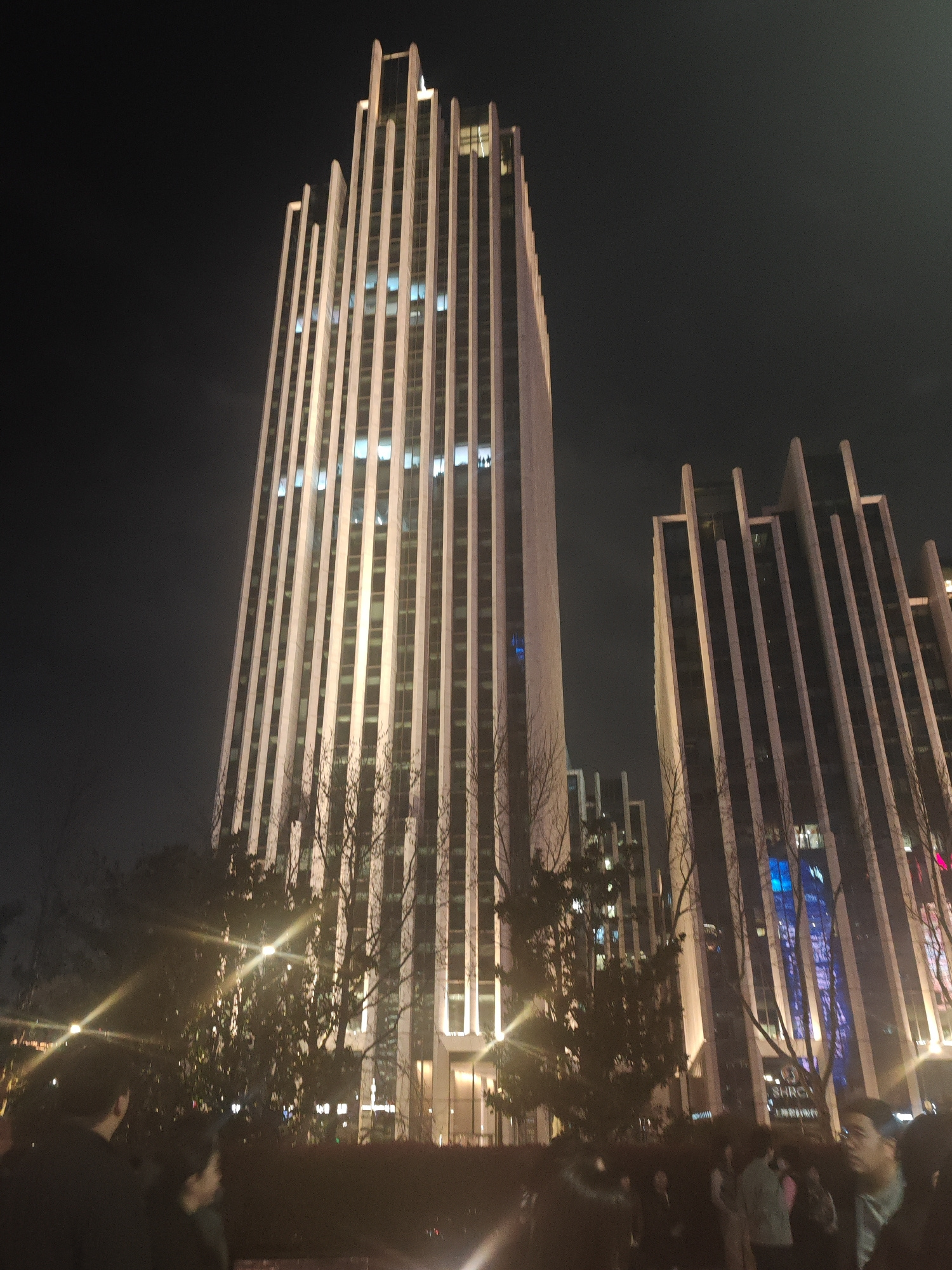 The image displays a nighttime urban scene in the Xuhui Riverside area of Shanghai, China. A tall, modern skyscraper dominates the left and central frame, characterized by a facade composed of numerouβ¦read more