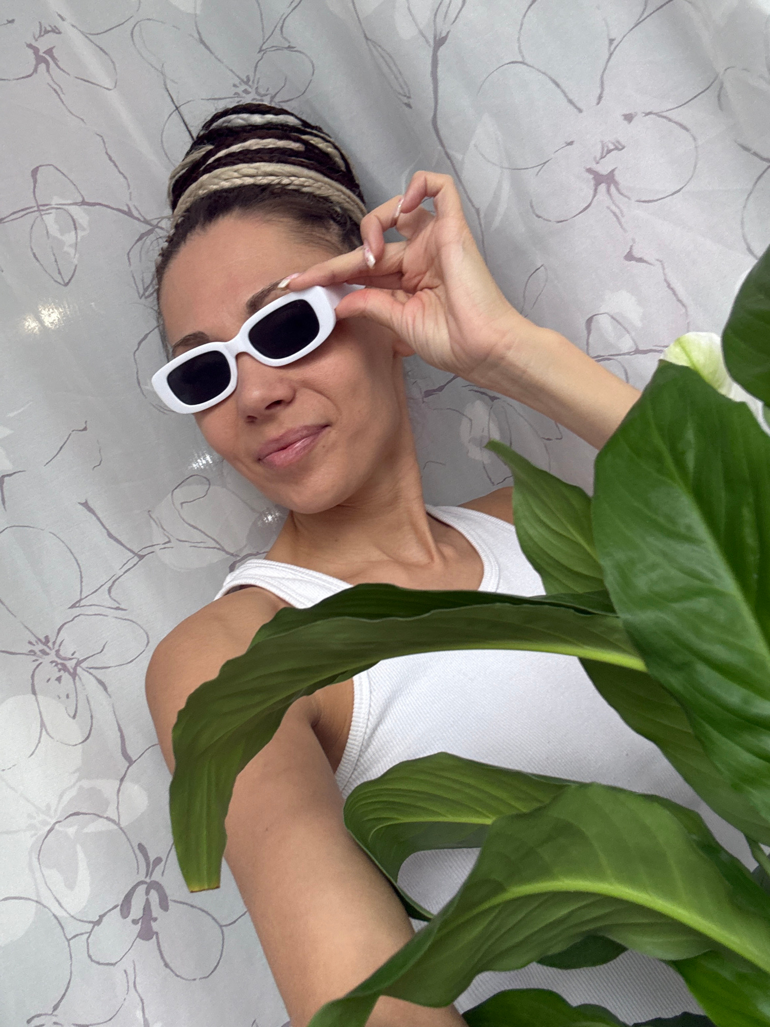 A woman is lying on a surface patterned with stylized floral designs. She wears a white tank top and white-framed sunglasses. Her hair is styled in black and blonde braids. The woman's hand is near heβ¦read more