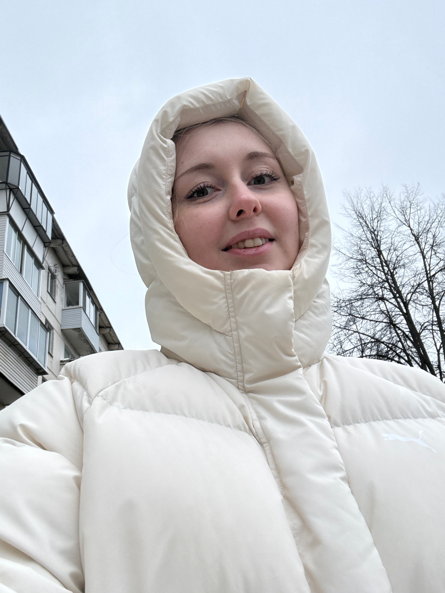 The image is taken from a low-angle perspective, showing a young woman wearing a white puffer jacket with the hood up. She is smiling slightly. In the background, there is a leafless tree against a gr…read more