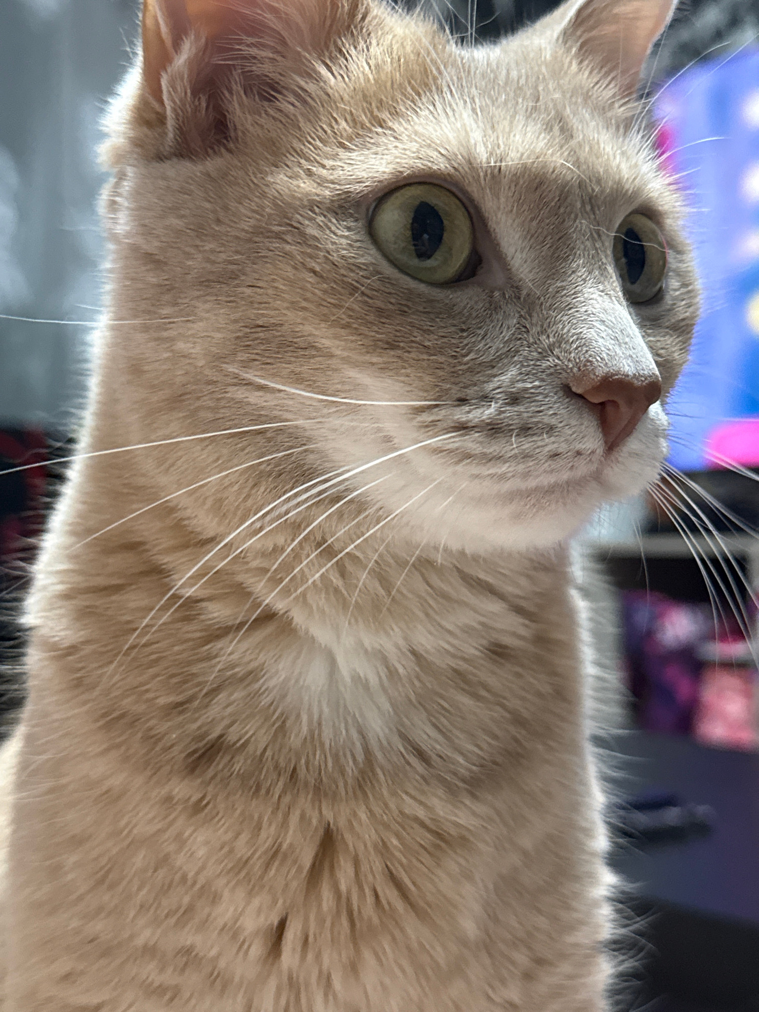 A close-up, slightly angled shot of a light-furred cat with light green eyes. The cat's head is tilted upwards, with a focus on its facial features, including its nose and whiskers. The background is…read more