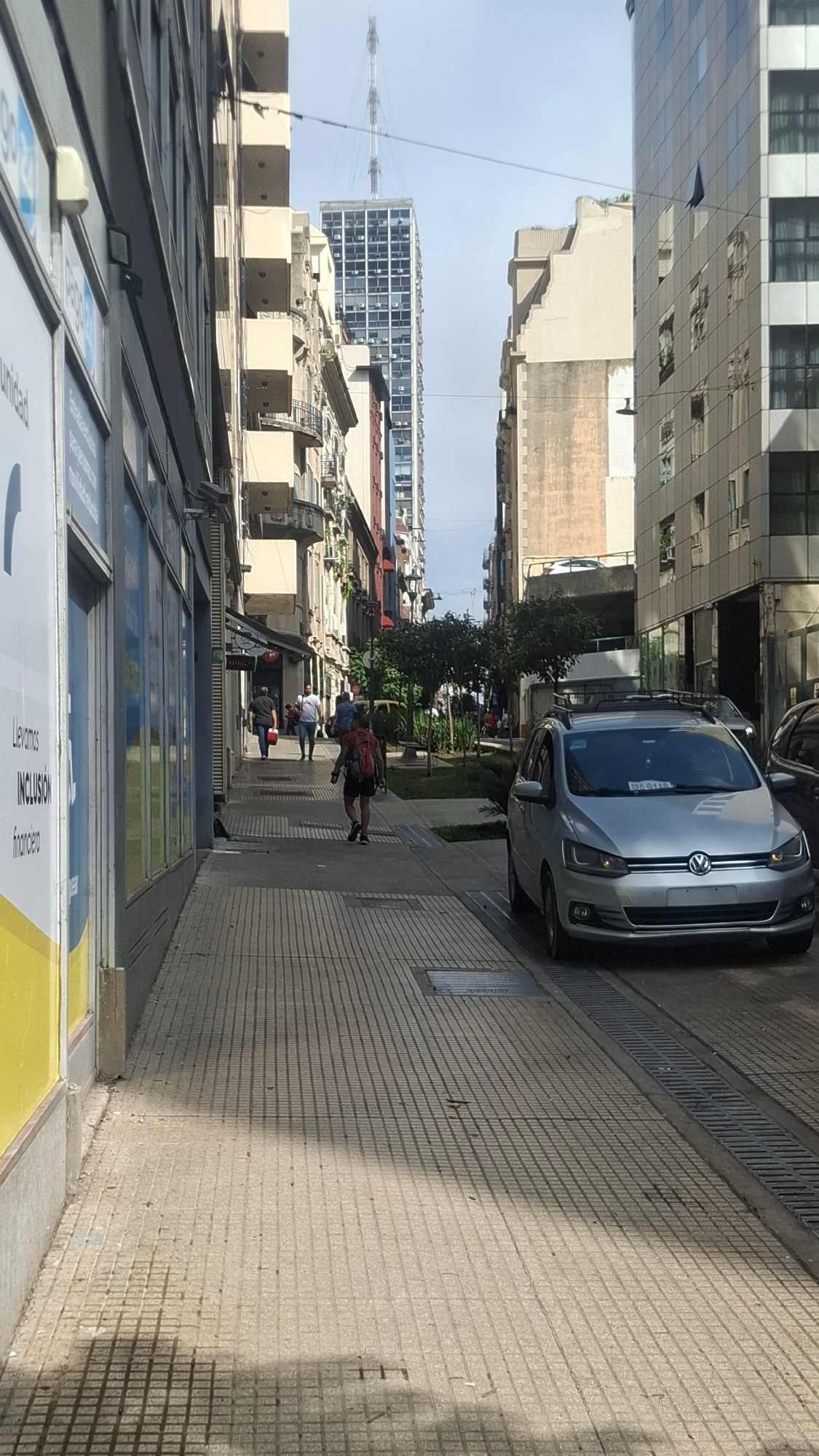 The image shows a street in Buenos Aires, Argentina. A silver Volkswagen car is parked on the right side of the street. People are walking on the sidewalk. Buildings are visible on both sides of the sā¦read more