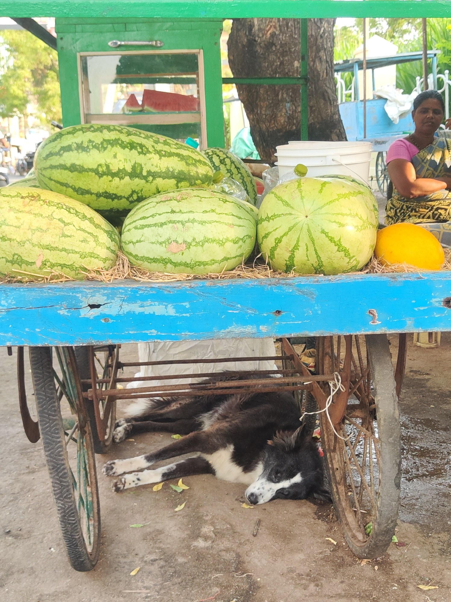 In Puttaparthi, India, the scene captures a vendor with a vibrant display of watermelons stacked high on a colorful cart, painted in hues of green and blue. A melon also sits atop the pile. An Indian…read more