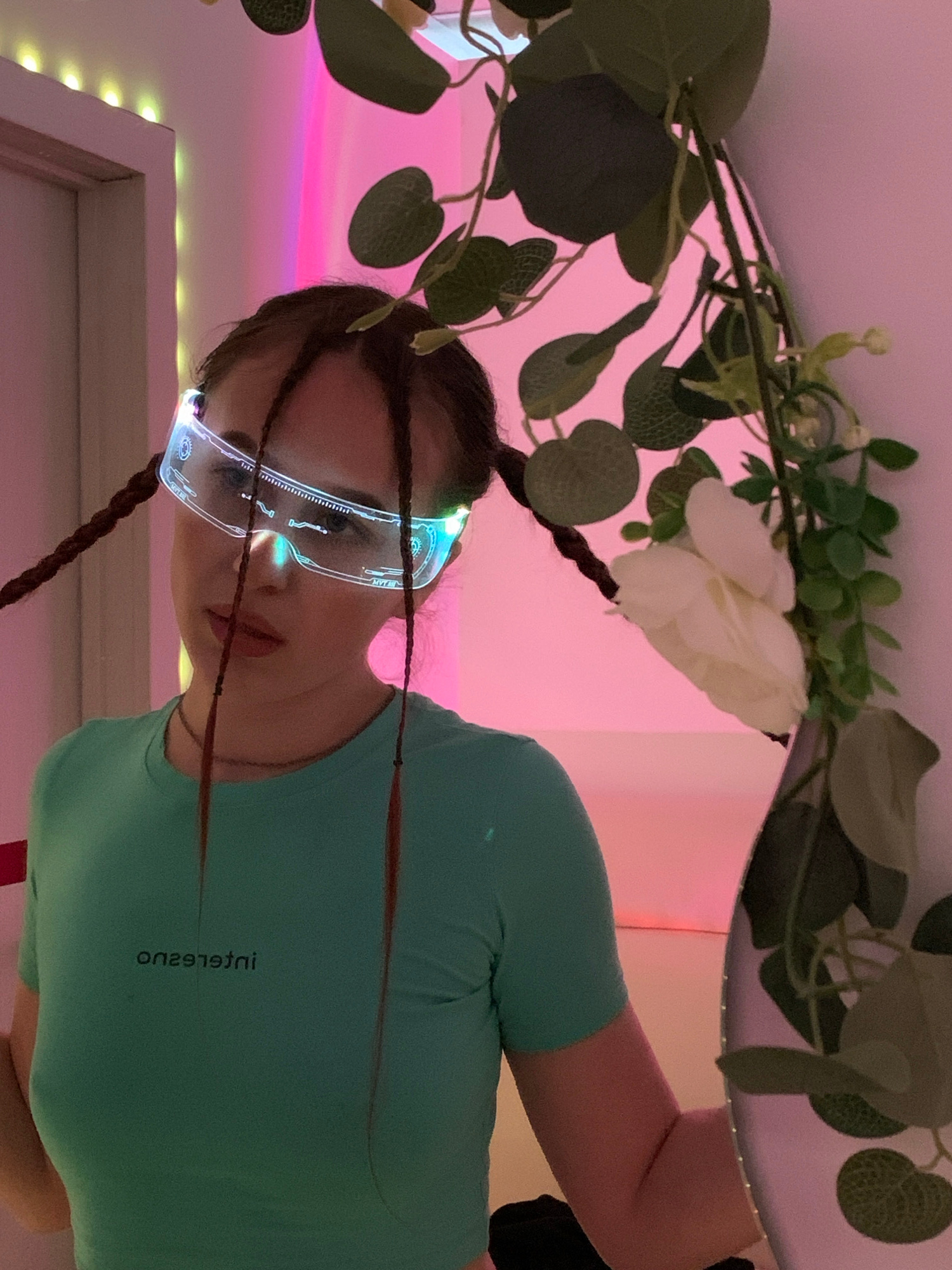 A woman wearing illuminated futuristic glasses and a light green shirt is shown in an indoor scene. The lighting has a pink and purple hue, possibly from LED lights. There are artificial leaves and a…read more