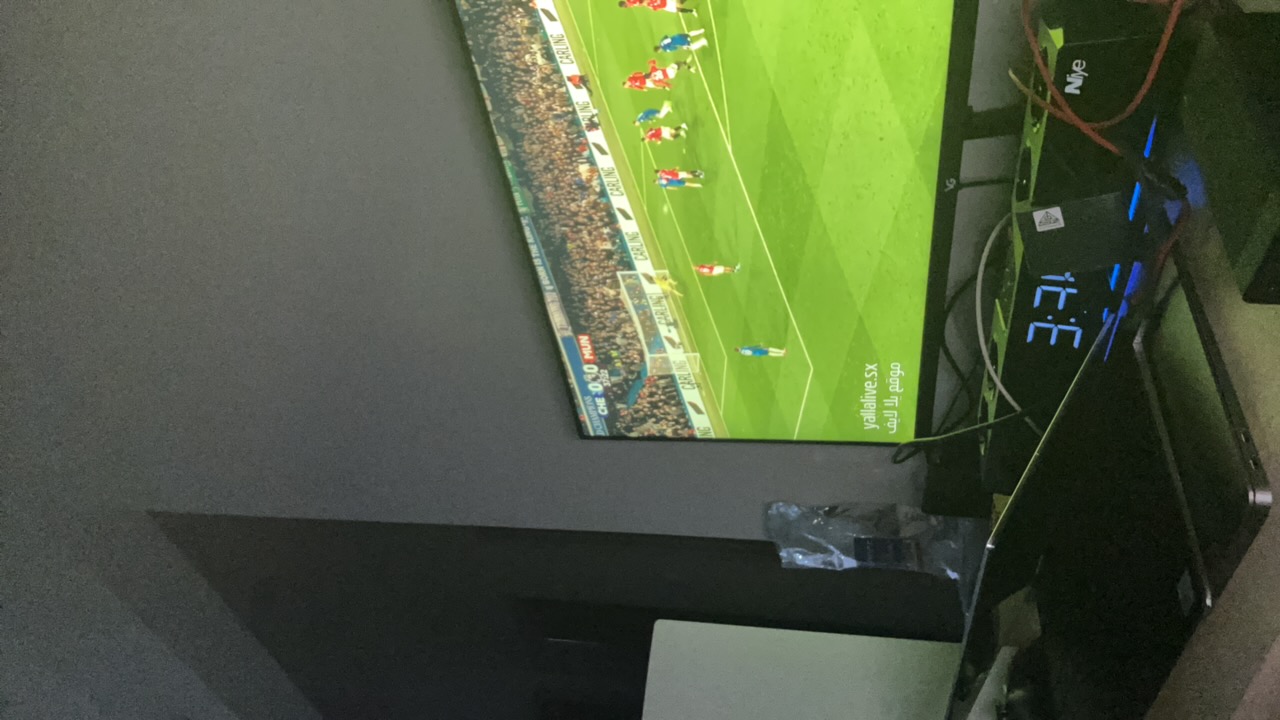 A TV screen displays a soccer game between CHE and MUN. The score is 0-0 and the game is in the 42nd minute. Players in blue and red uniforms are on the green field. Text at the bottom left of the scr…read more