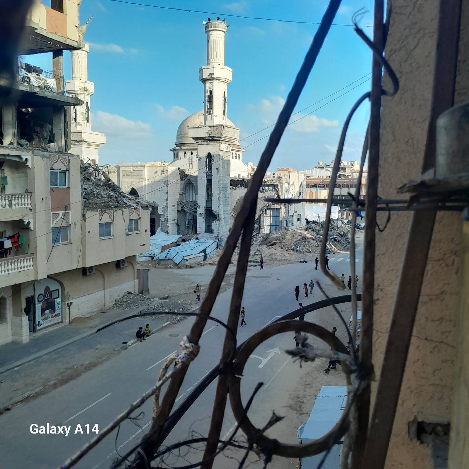 The image depicts a street in Khan Yunis, Palestinian Territory, showing extensive damage to buildings. A mosque with a minaret is visible in the background, heavily damaged. Debris is scattered acros…read more