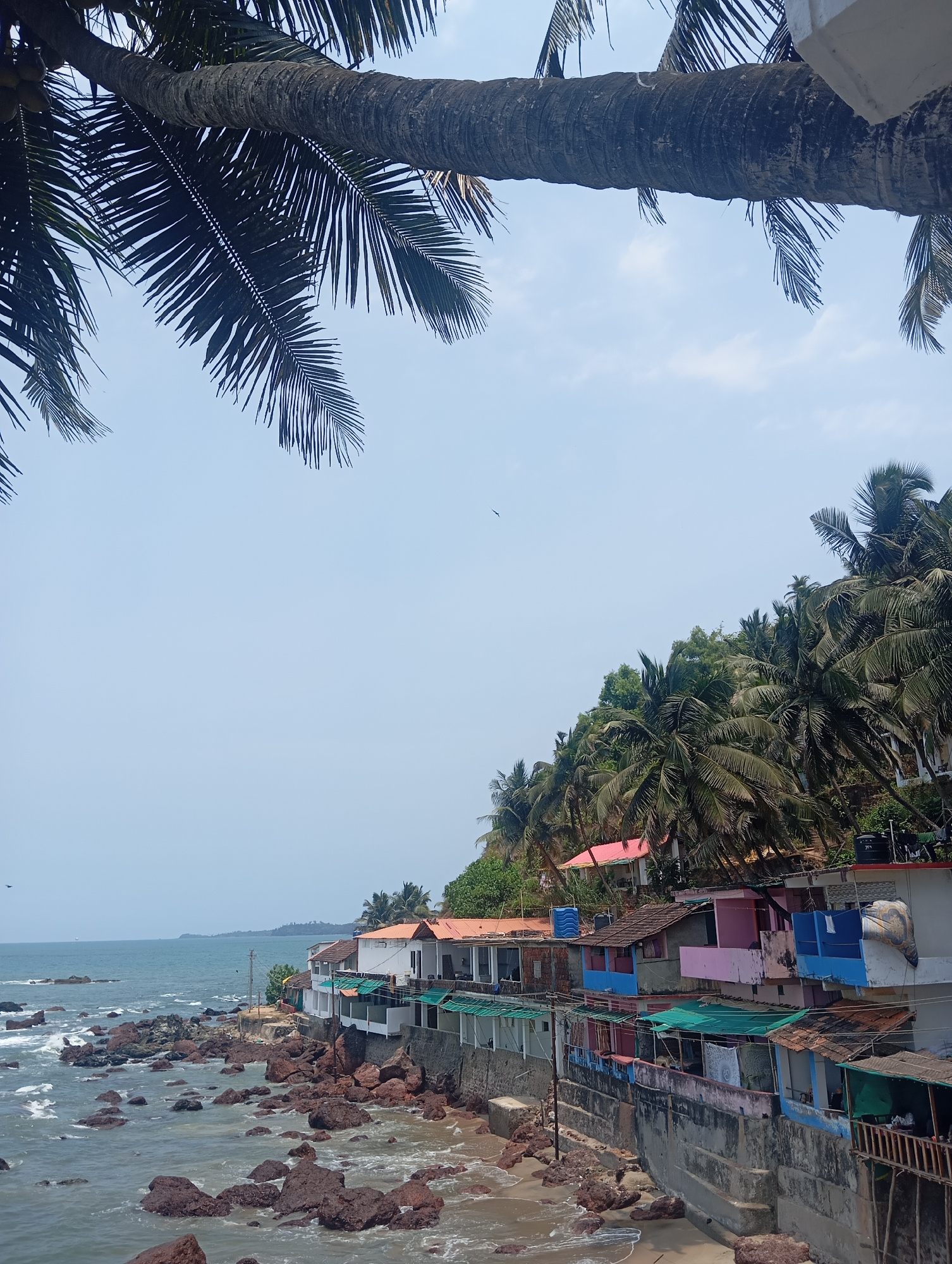 The image presents a vibrant coastal scene, likely in Querim, India, under a bright, clear daytime sky. A large palm tree trunk and its dark green fronds prominently frame the top of the photograph, c…read more
