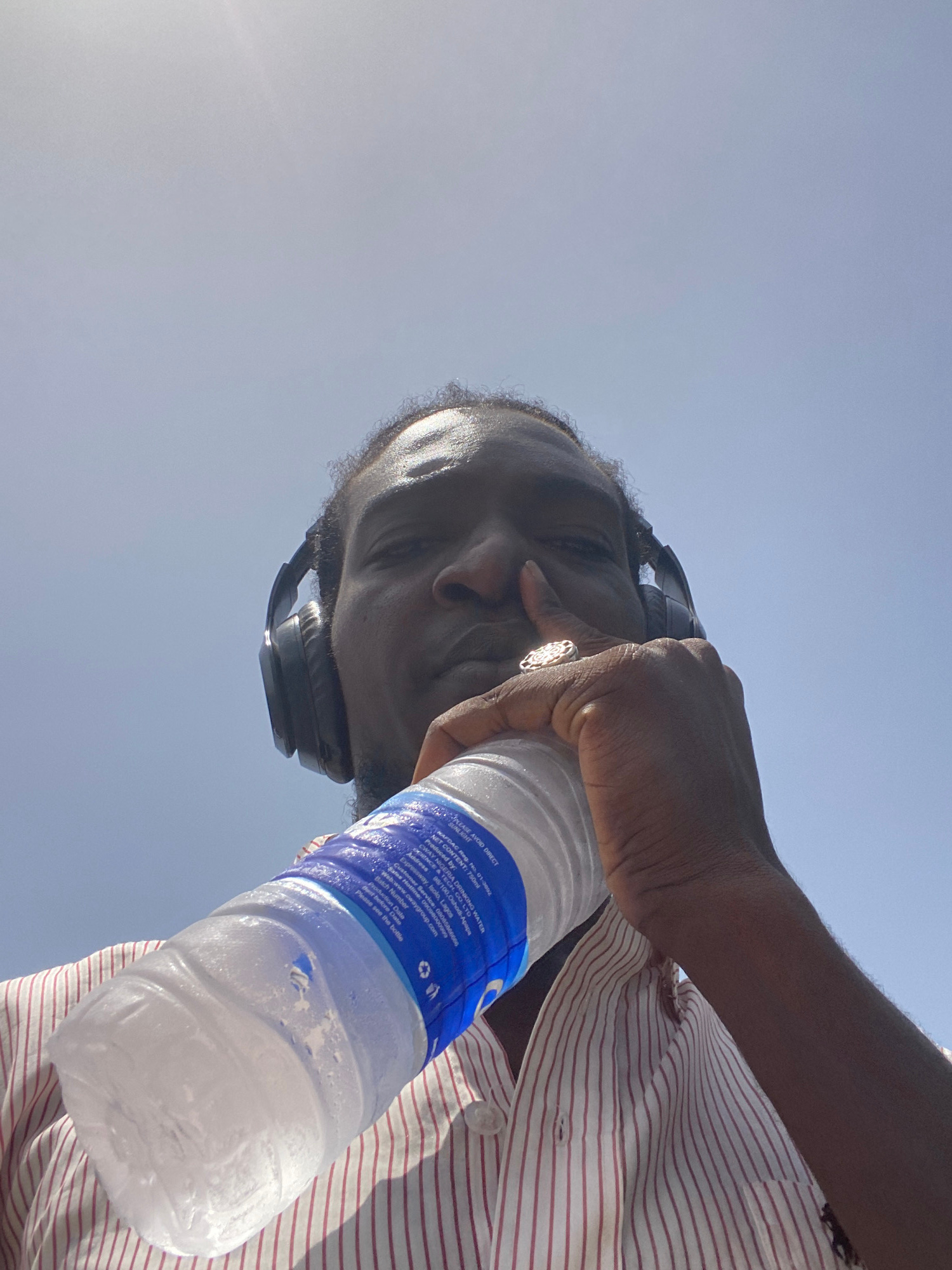 A man with dark skin wearing headphones and a striped shirt holds a chilled water bottle with a blue label. The bottle's label indicates it is produced by CWAY Nigeria Drinking Water, a company with a…read more