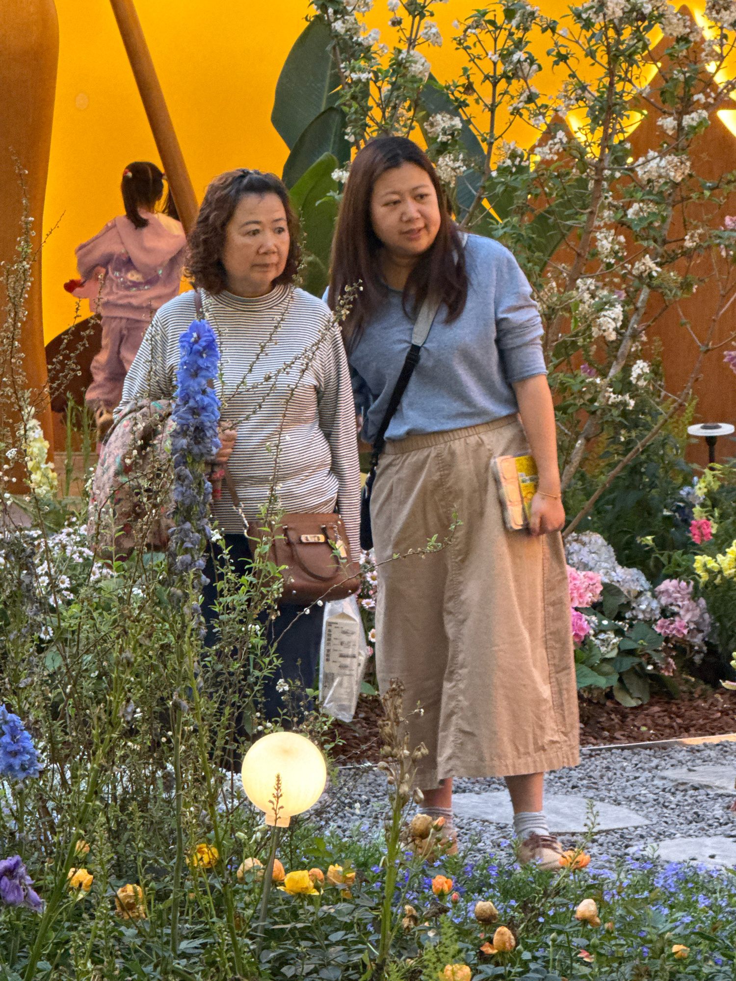 Two women are posing for a photo amidst a floral display. The woman on the left is wearing a striped shirt, while the woman on the right is wearing a blue sweater and tan pants. They are positioned am…read more