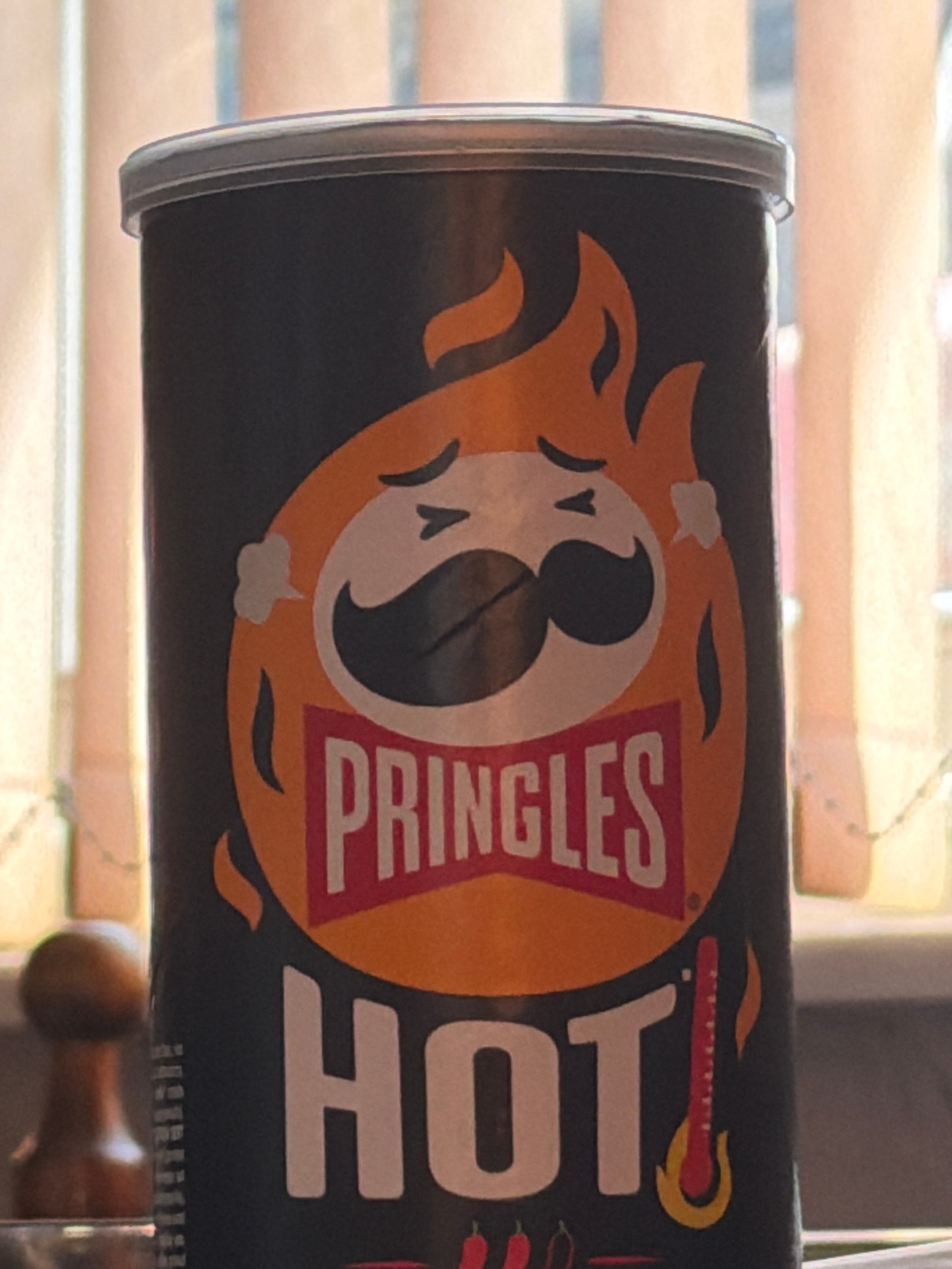 The image shows a can of "Hot" Pringles. The can is black with a stylized orange flame design surrounding the Pringles logo and the word "HOT" in white. The can has a silver rim. The background is blu…read more