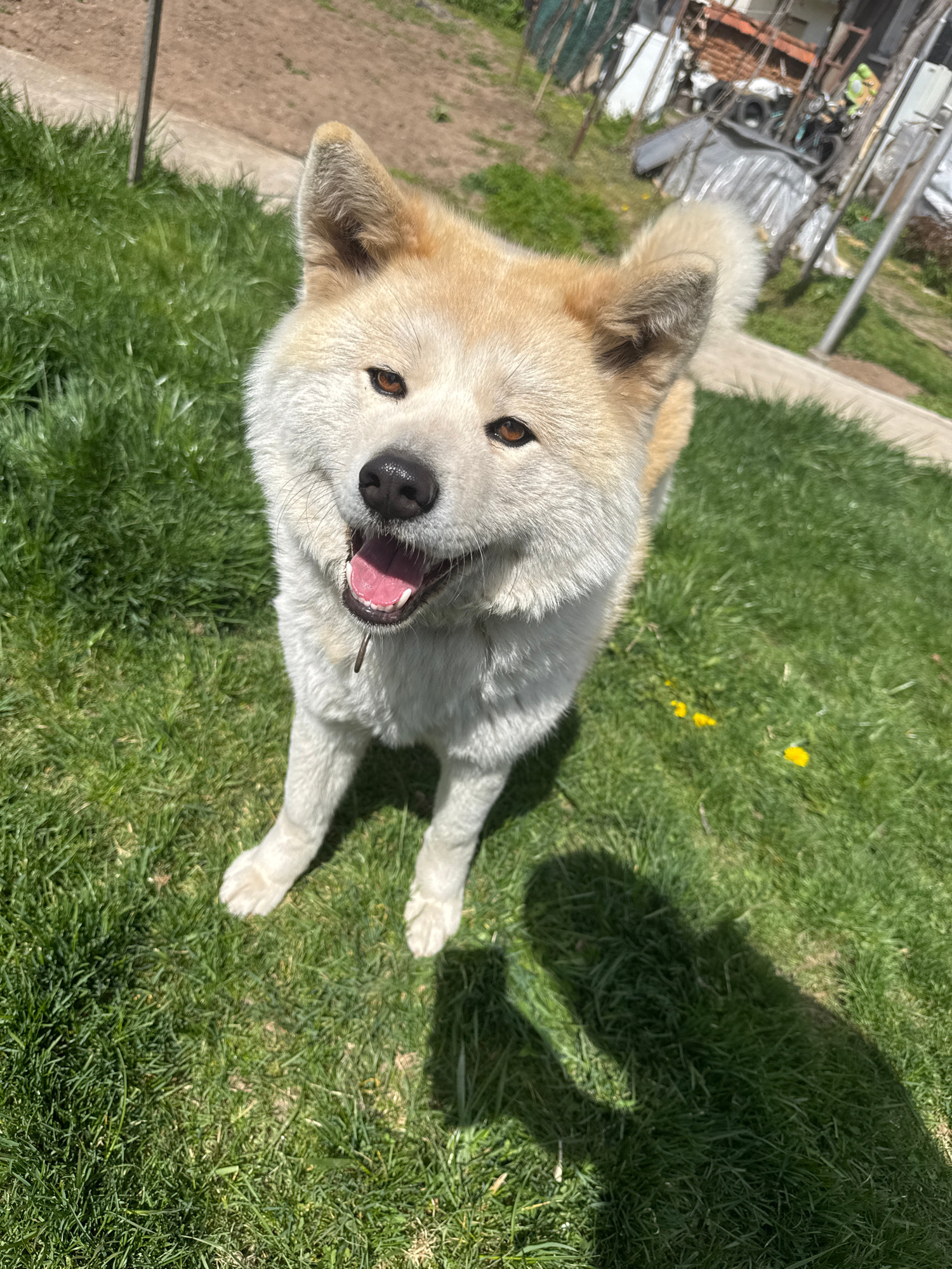 An Akita dog is standing in a patch of green grass. The dog has a light tan and white coat, brown eyes, and a black nose. Its mouth is open, and its tongue is visible. The camera is positioned above t…read more