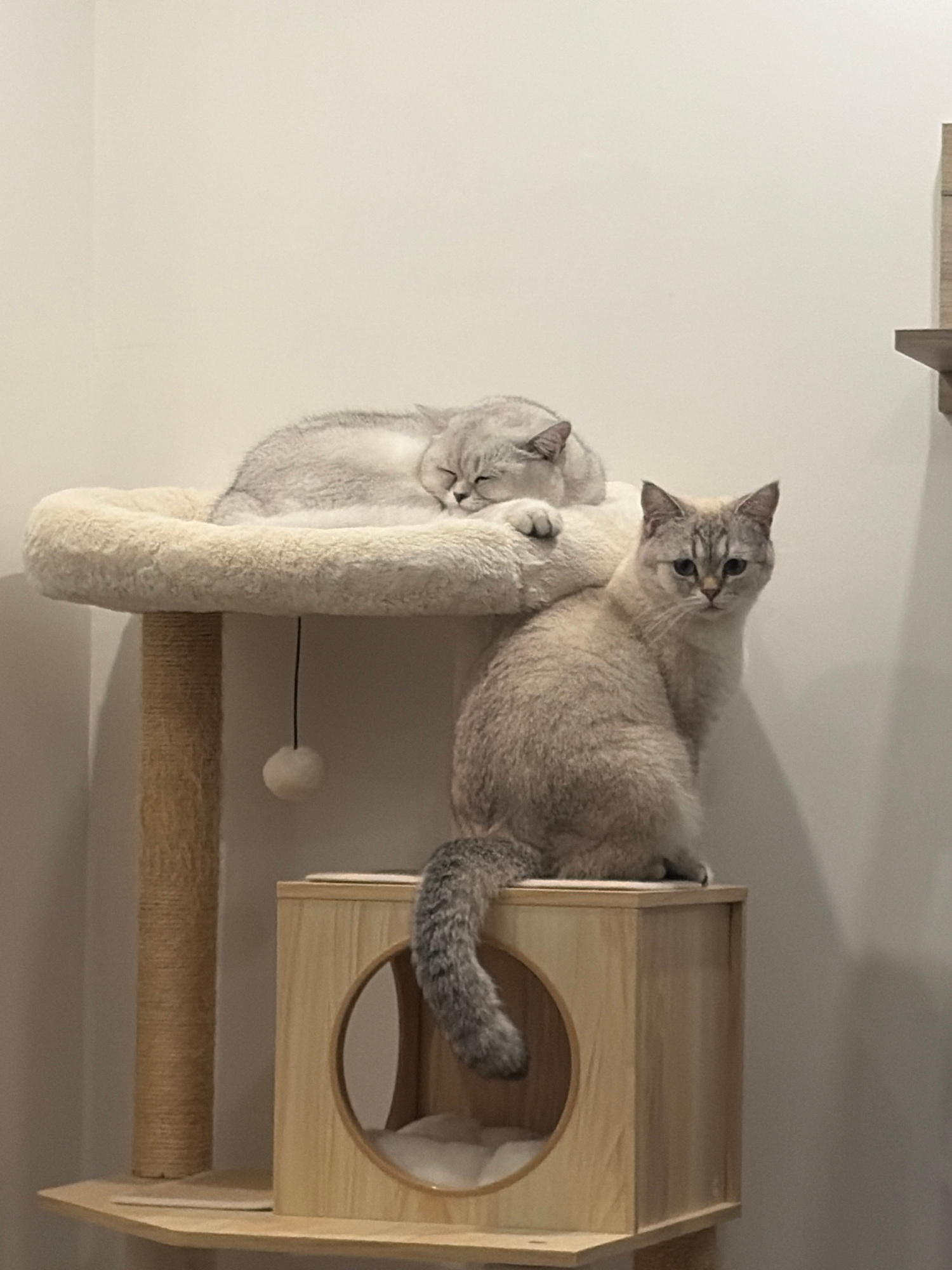 Two domestic cats, likely a light-colored breed such as British Shorthair or a similar mix, are resting on a multi-level cat furniture unit. The cat on the left is curled up, appearing to sleep soundl…read more