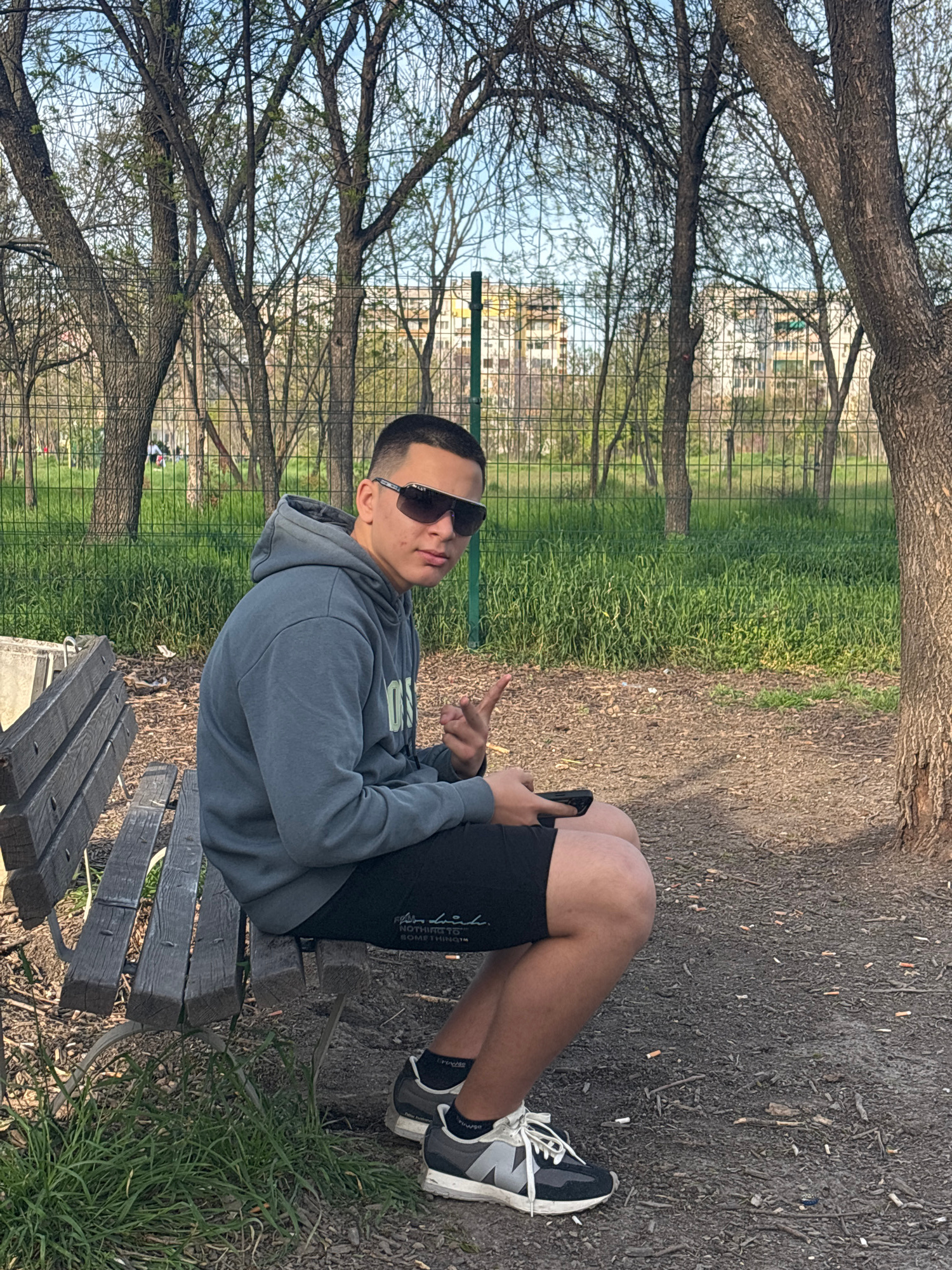 A young man sits on a wooden bench in a park. He wears sunglasses, a grey hooded sweatshirt, black shorts with text on the leg, and athletic shoes with black socks. He's holding a cell phone in one ha…read more