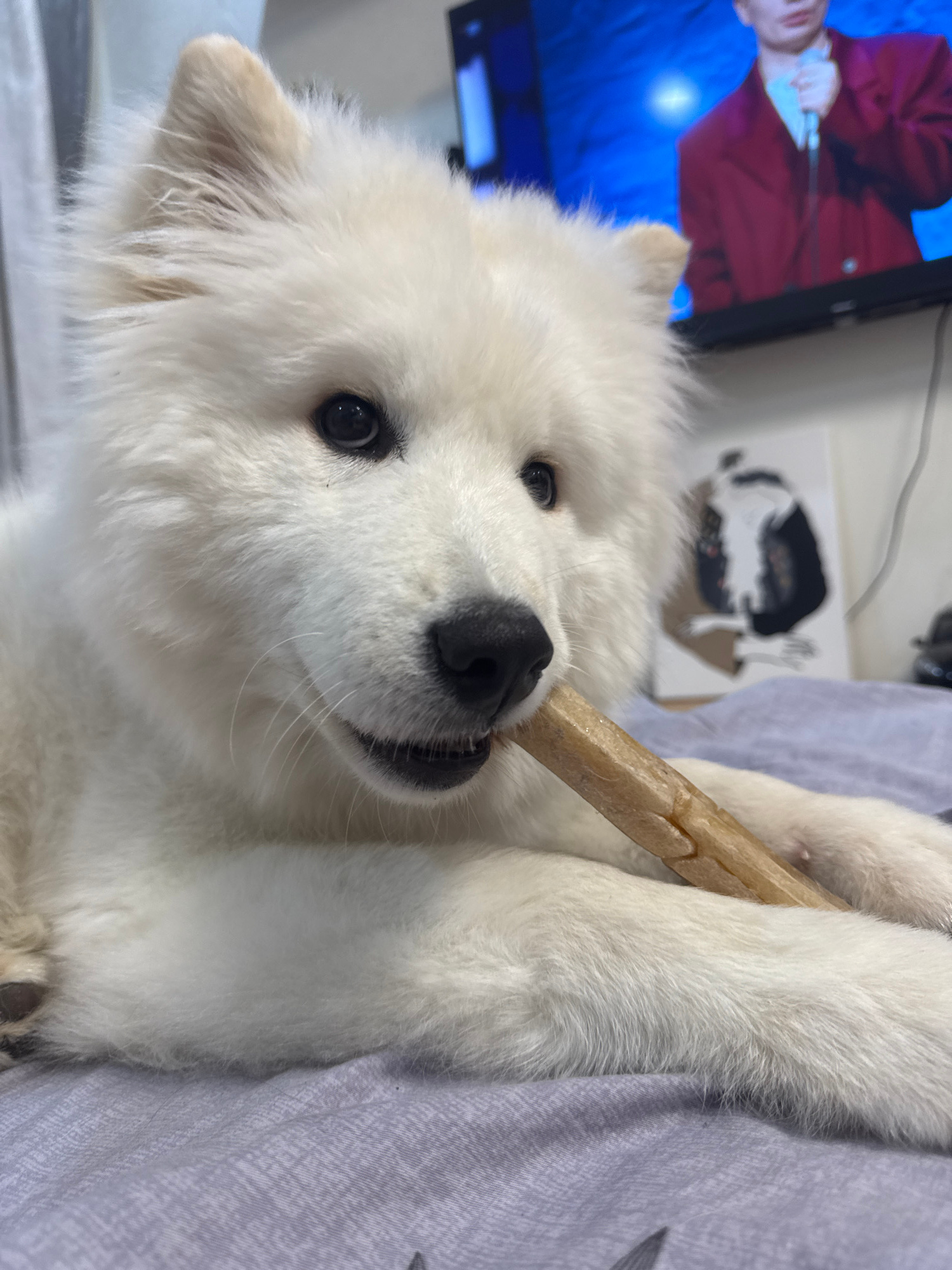 A white Samoyed puppy is chewing on a light brown rawhide chew. The puppy is lying on a light purple textured surface, possibly a bed. In the background, a television displays a person in a red jacket…read more