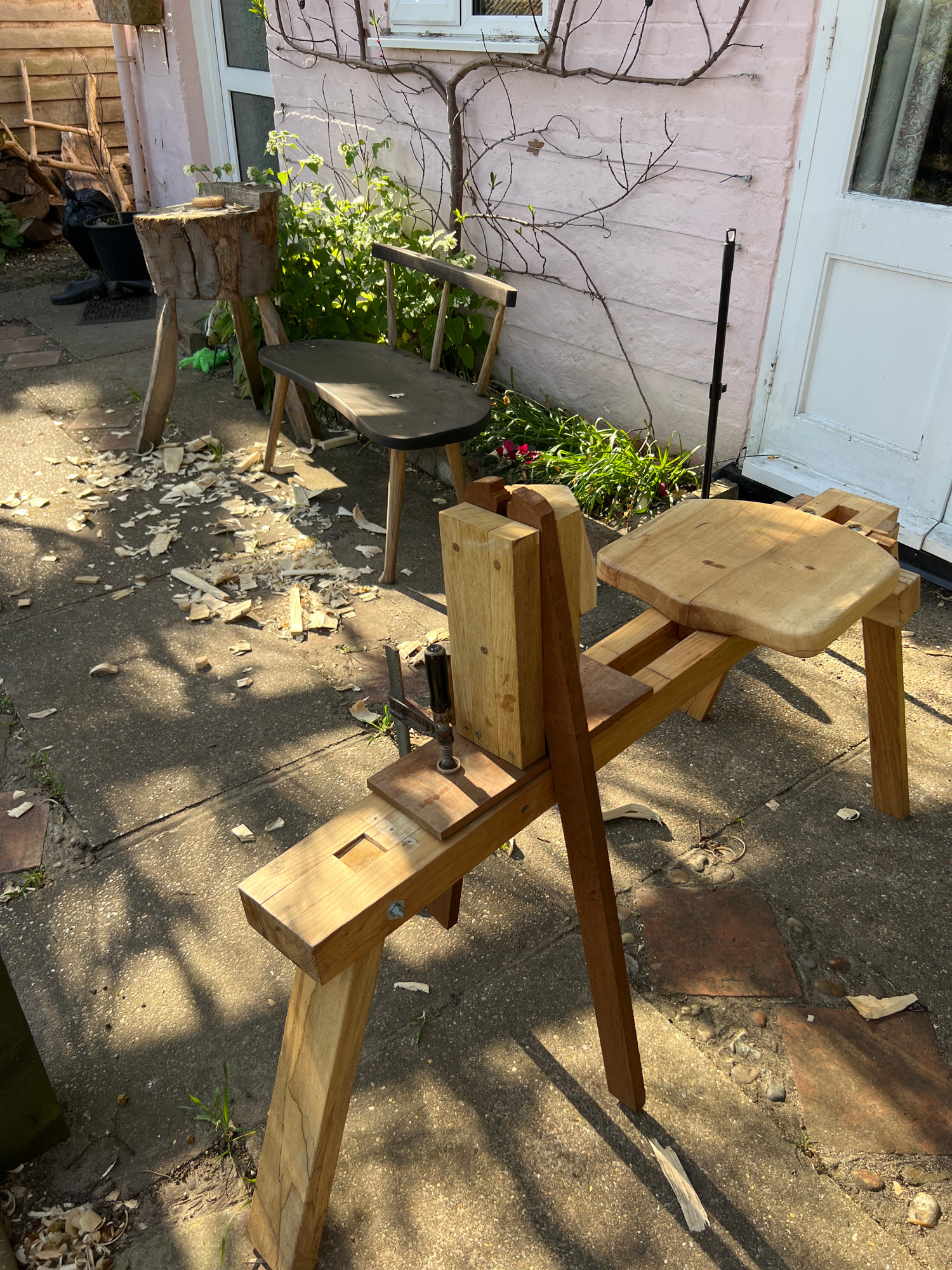 The image shows an outdoor woodworking setup in East Suffolk, United Kingdom. A shave horse and stump stand are present on a concrete surface, scattered with wood shavings. A pink brick building with…read more