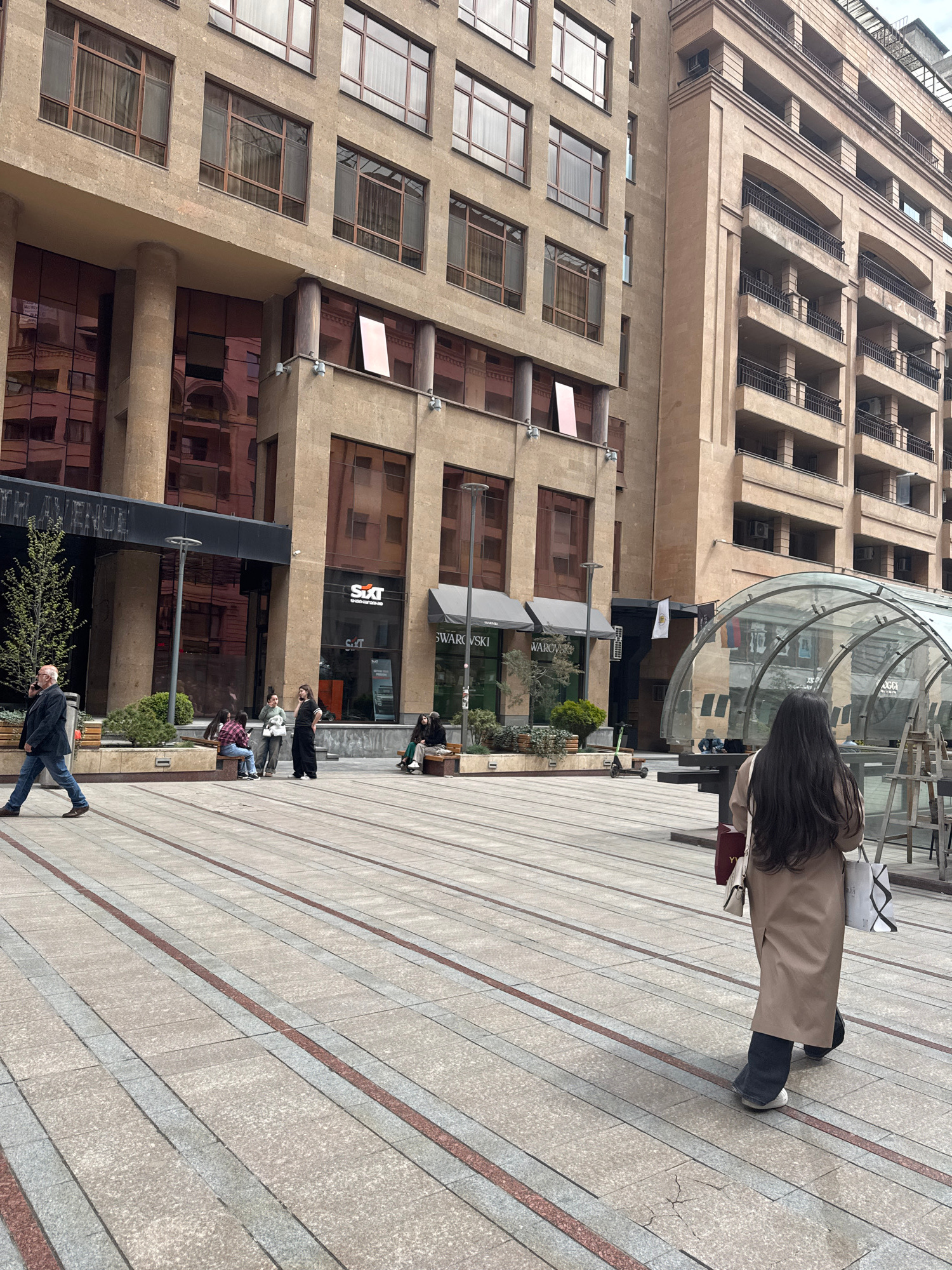 The image depicts a street scene in Yerevan, Armenia. A tall, beige building with numerous windows dominates the left side of the frame. The building's architecture features decorative columns and pro…read more