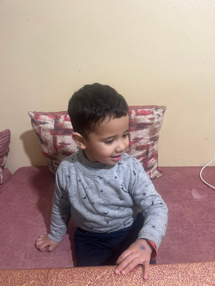 A single, fair-skinned male child, approximately 2-4 years old, is depicted indoors in Ouaouizert, Morocco. The child has short, dark, curly hair and is wearing a grey long-sleeved turtleneck shirt ad…read more