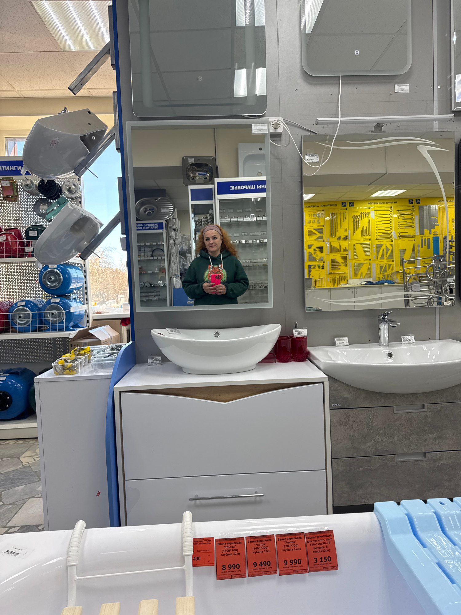 The image appears to be taken inside a plumbing supply store in the city of Chaikovsky, Russia. A woman with red hair and a gray headband is visible in the reflection of a mirror, holding a pink phone…read more