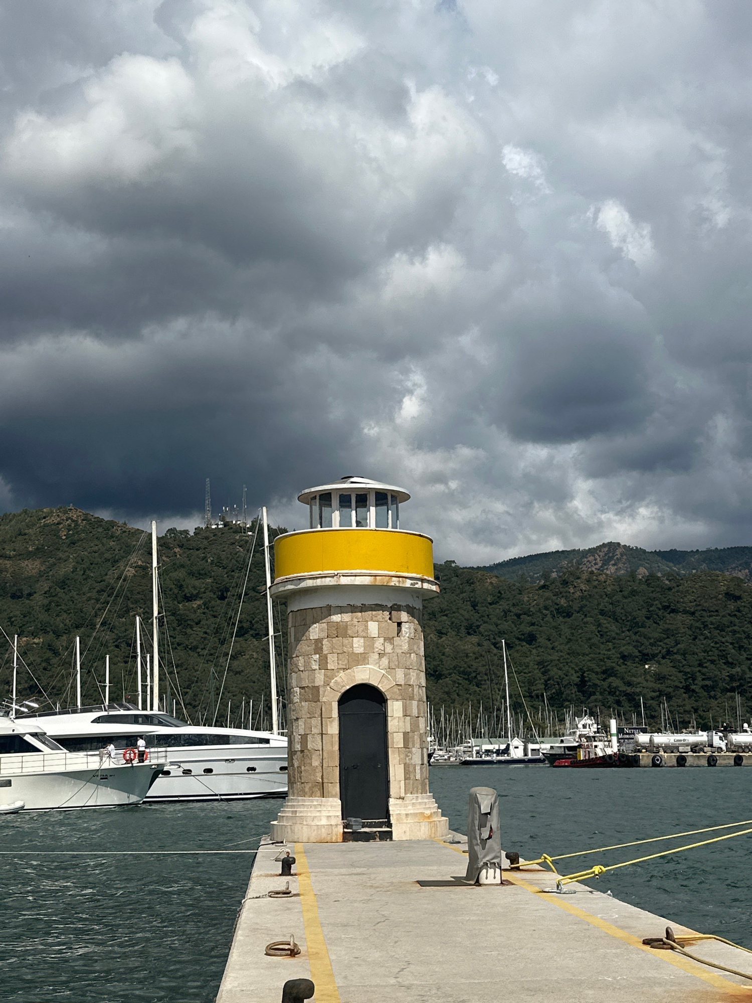 The image depicts a view of the Marmaris Lighthouse, situated at the entrance to the Marmaris harbor in Turkey. The lighthouse is a squat, two-story structure, constructed of rough-hewn stone on its b…read more