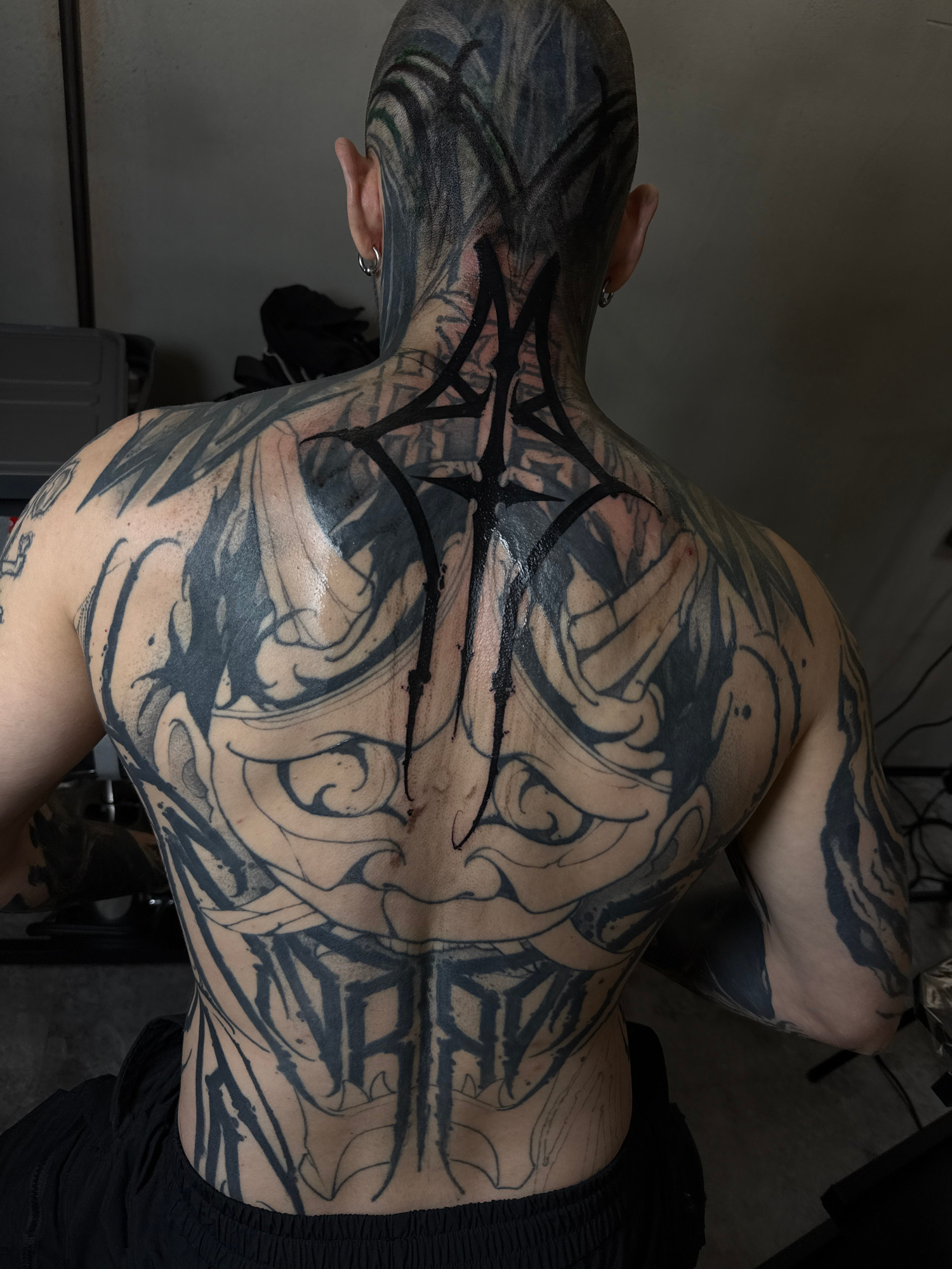 The image, likely captured in a tattoo studio in Moscow, Russia, presents a close-up view of a person's back, neck, and head, extensively covered in blackwork and ornamental tattoos. The individual is…read more