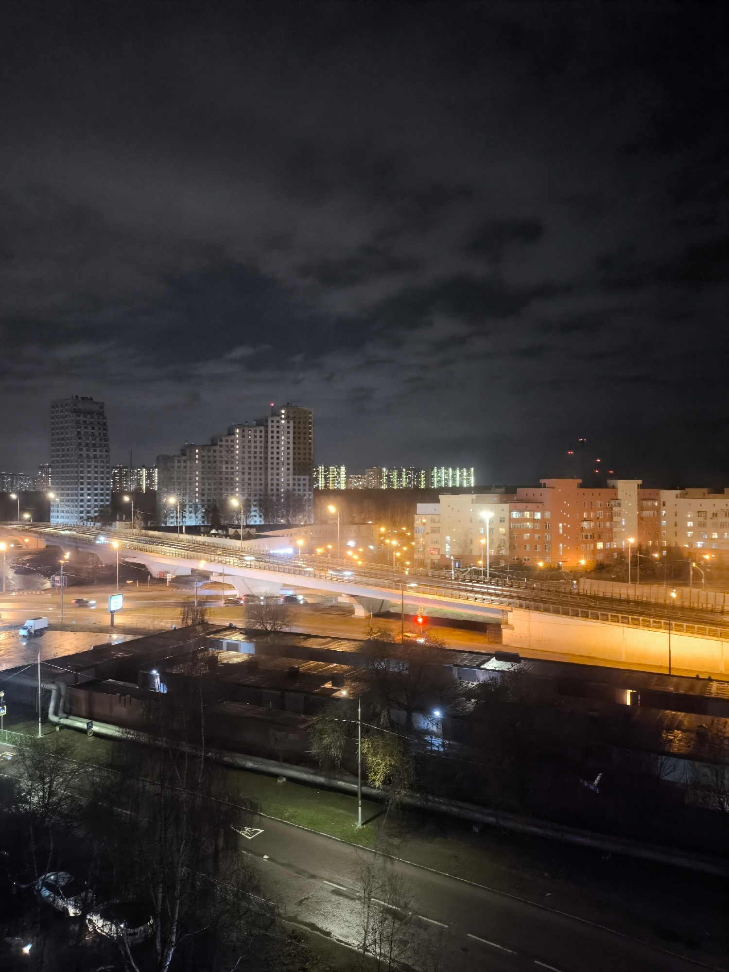 The image presents a nighttime cityscape in Moscow, Russia, under an overcast sky. Several apartment buildings are visible, illuminated with interior lights. A highway overpass, brightly lit with stre…read more