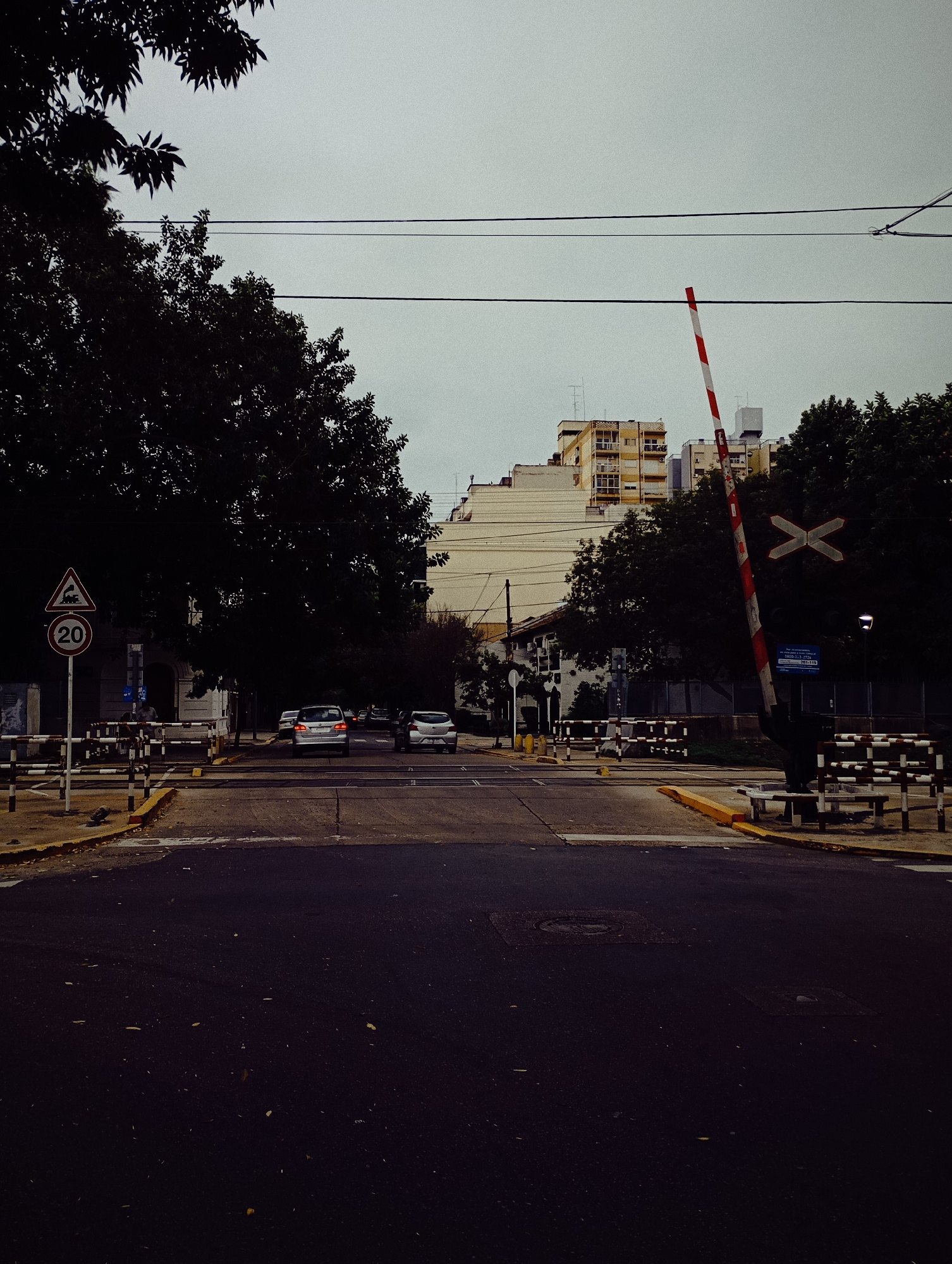 The image shows a street-level view of a railroad crossing in the city of Buenos Aires, Argentina. The crossing gates are in the down position, indicated by the red and white striped barrier angled ac…read more