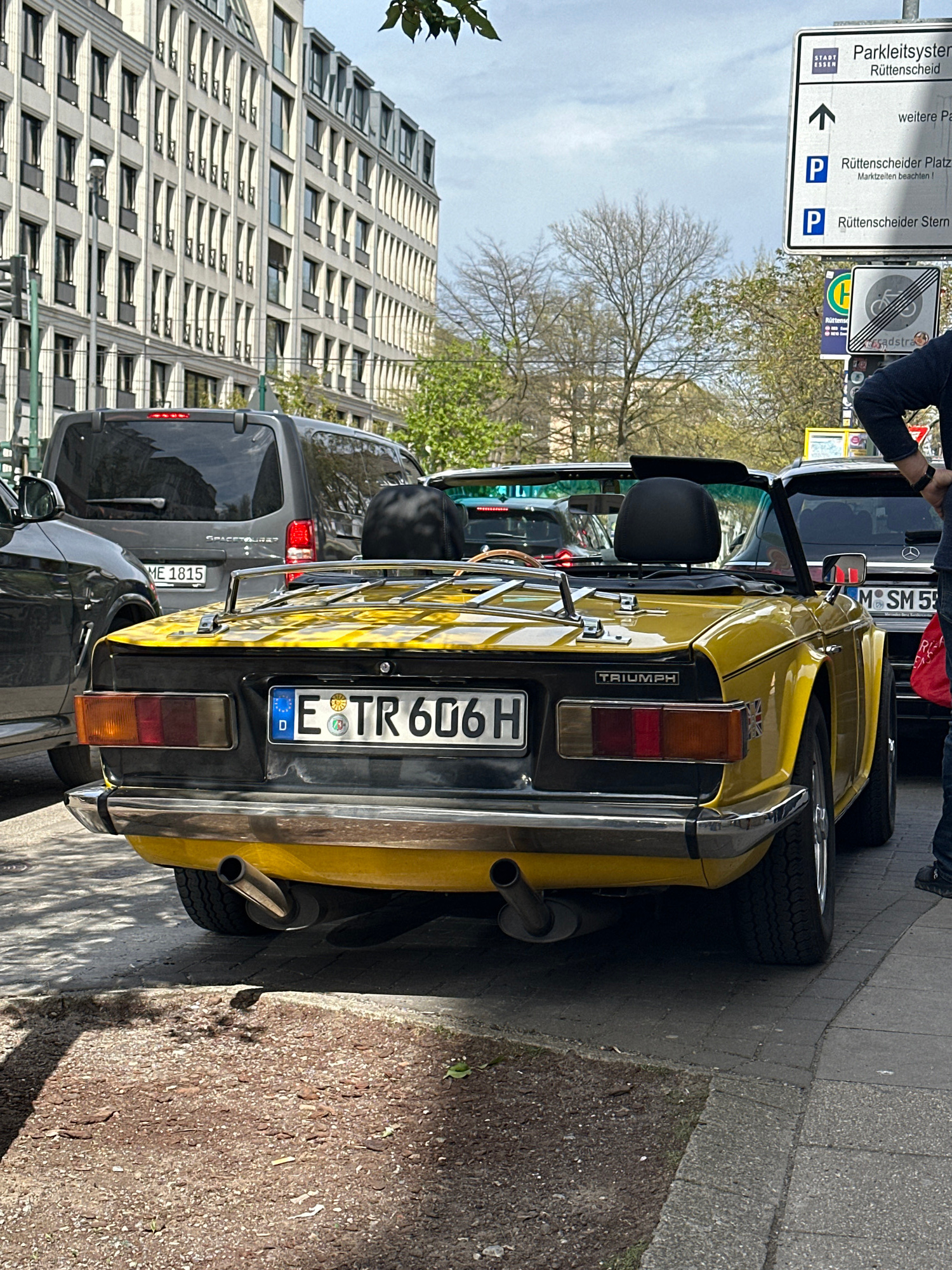 The image depicts a yellow Triumph sports car parked on a street in Essen, Germany. The license plate number is "E TR 606 H". Behind the Triumph is a dark gray van with the license plate "ME 1815". A…read more