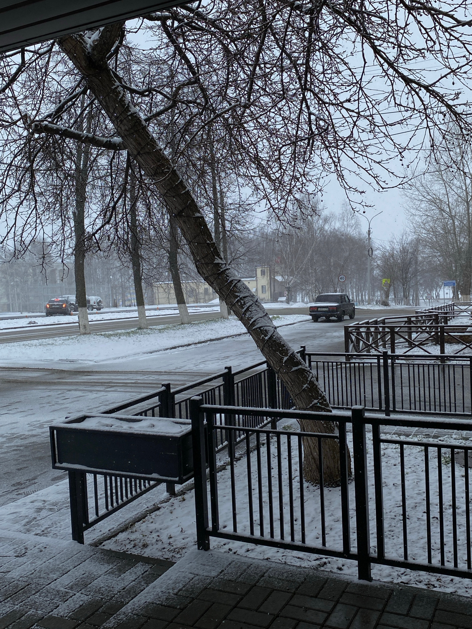 The image shows a snowy street scene in Votkinsk, Russia. A bare tree branch, lightly dusted with snow, extends across the left side of the frame, partially obscuring the view. A black metal railing a…read more