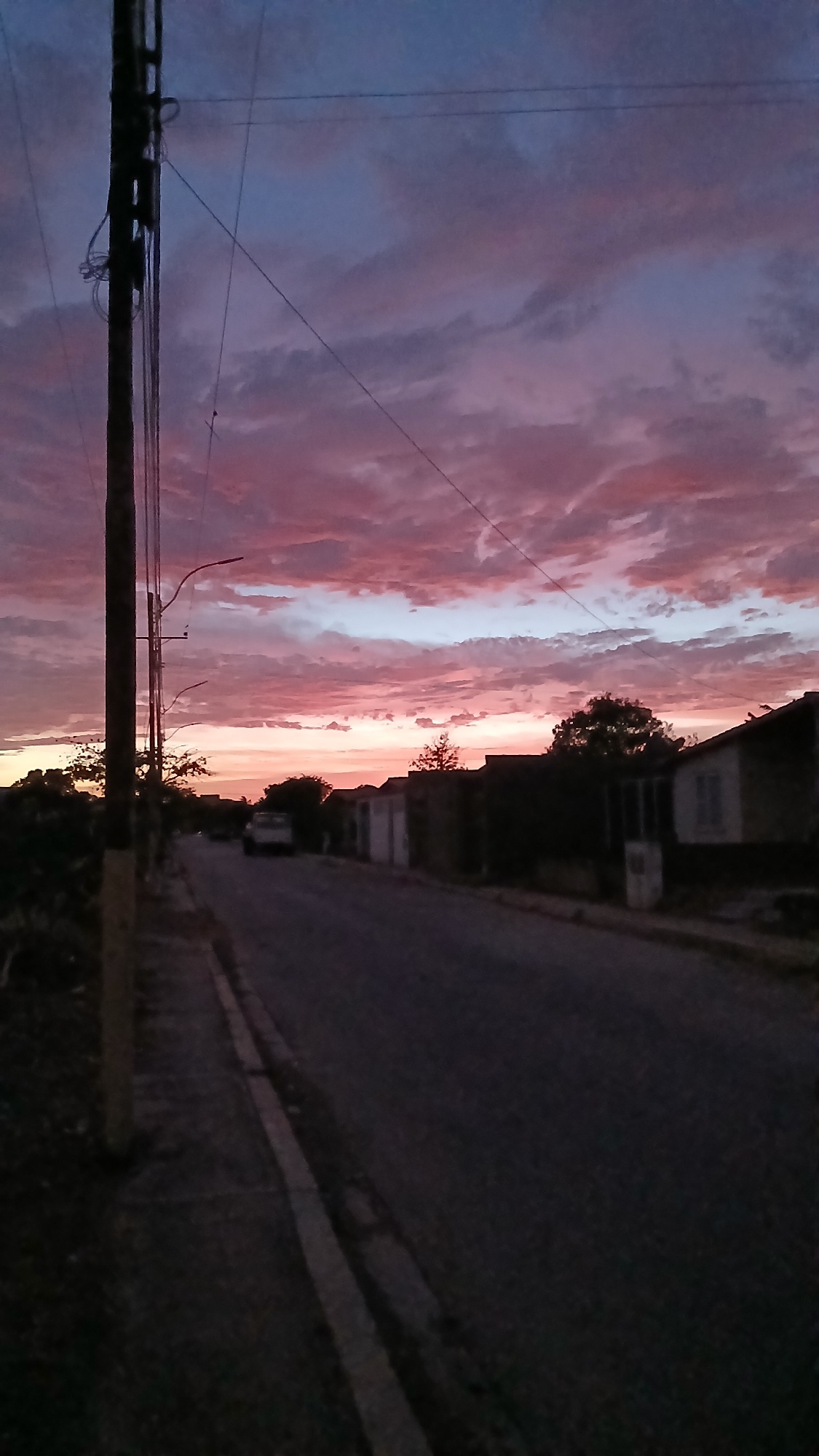 The image shows a street scene in Altagracia, Venezuela, at sunset. The sky is filled with pink and purple clouds. A utility pole with power lines is visible in the foreground on the left. On the righ…read more