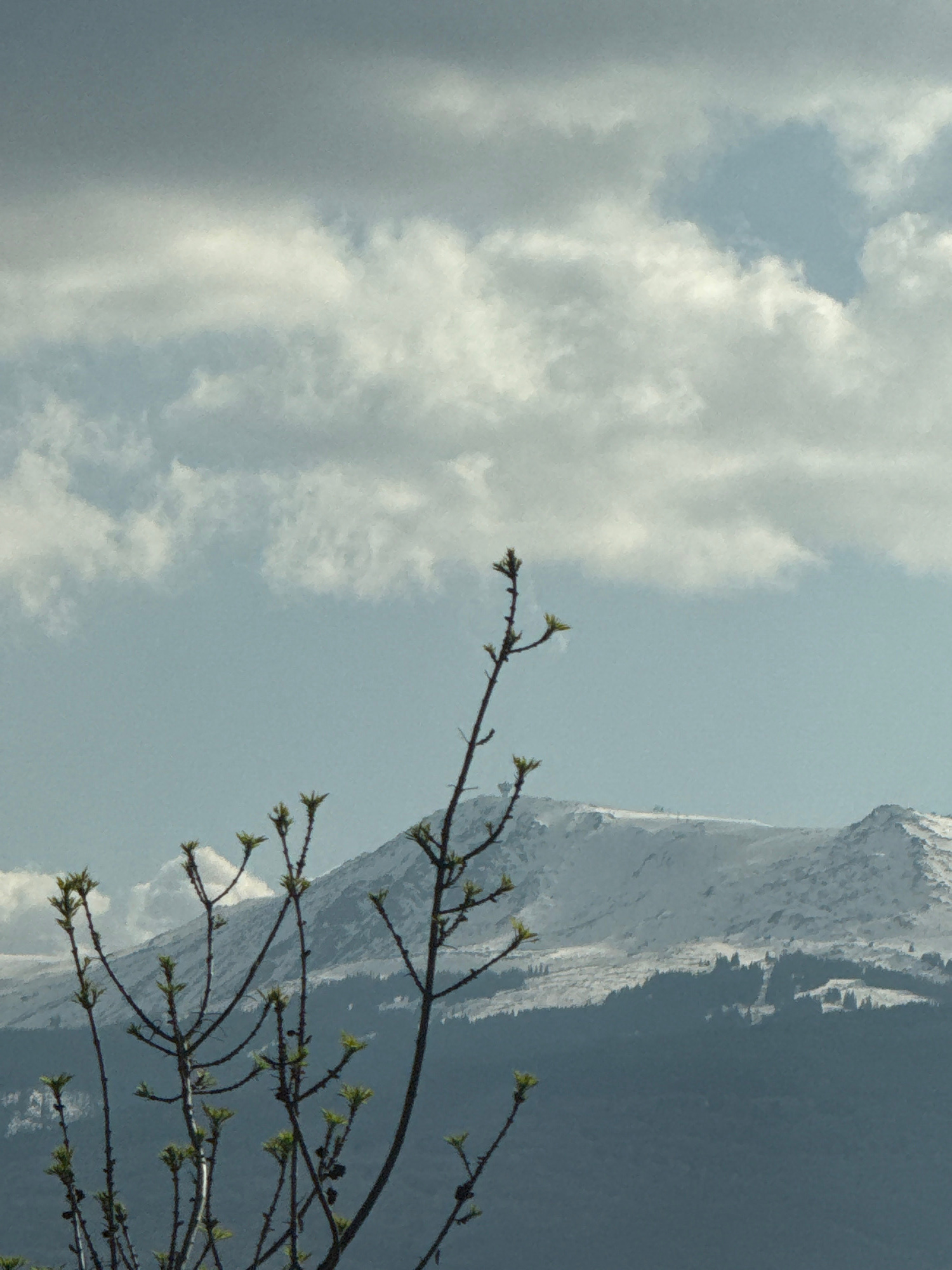 The image captures a scene with a tree branch bearing small, light-green buds in the foreground. Behind the branch, the left side of the image is filled with a sky containing clouds, while the right sā¦read more