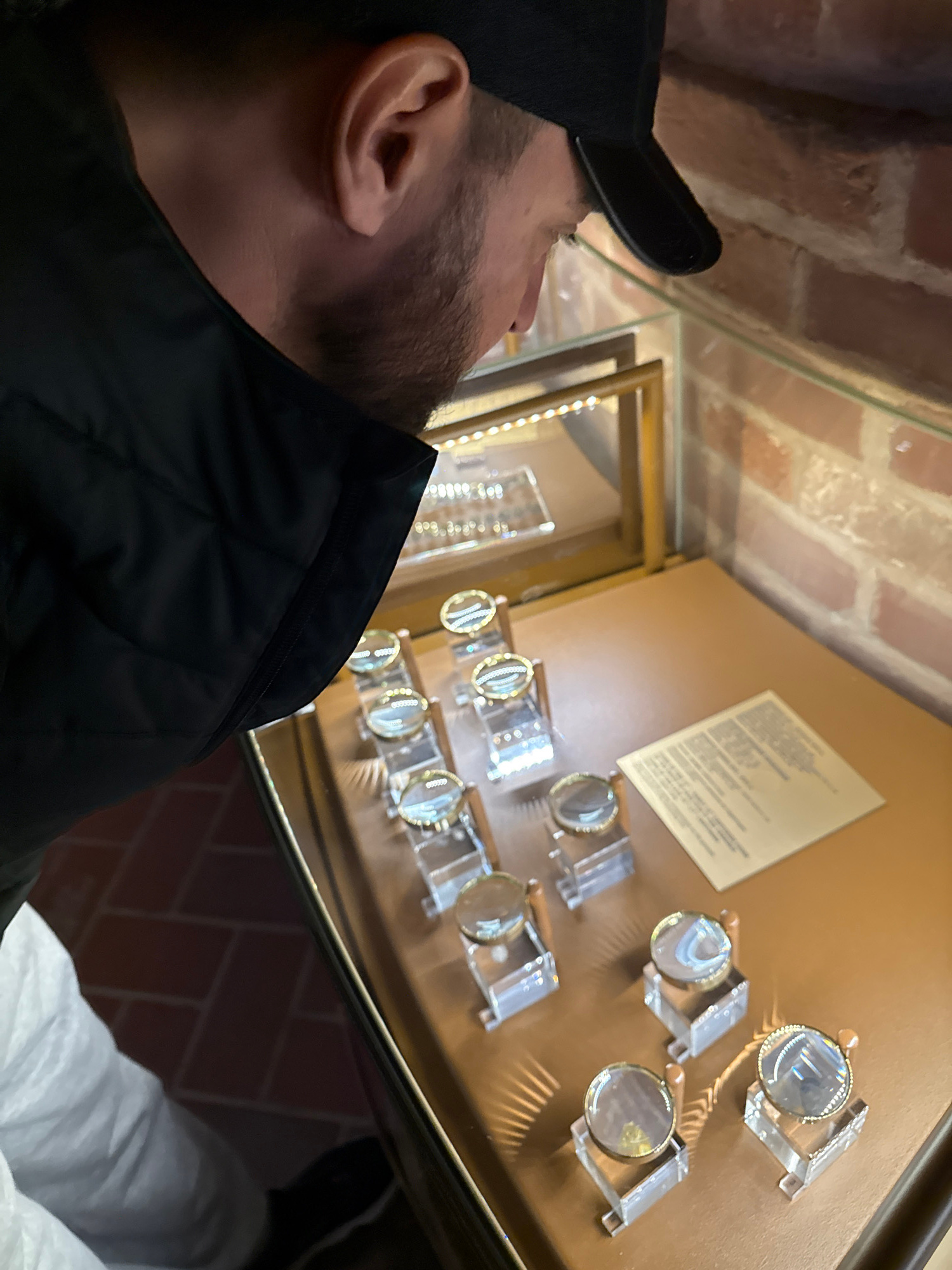 A man wearing a black baseball cap and a black jacket is looking at a display of eyeglasses in a shop. The eyeglasses are arranged on a brown surface, and there is a sheet of paper with text next to t…read more