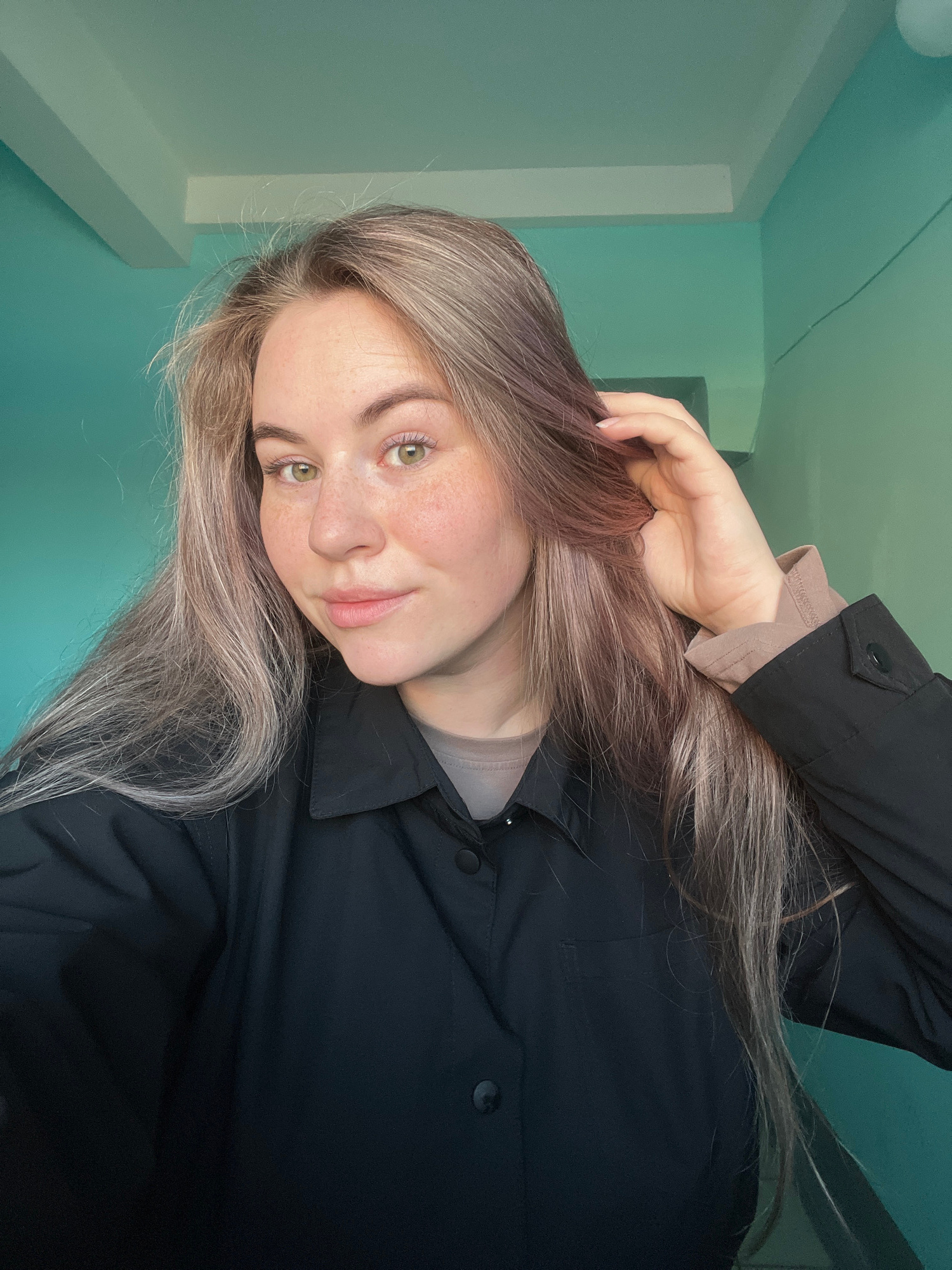 A young woman with fair skin, freckles, and long, light brown and grey hair is posing for a photo. She has light green eyes. She is wearing a black button-down shirt with a beige undershirt. Her right…read more