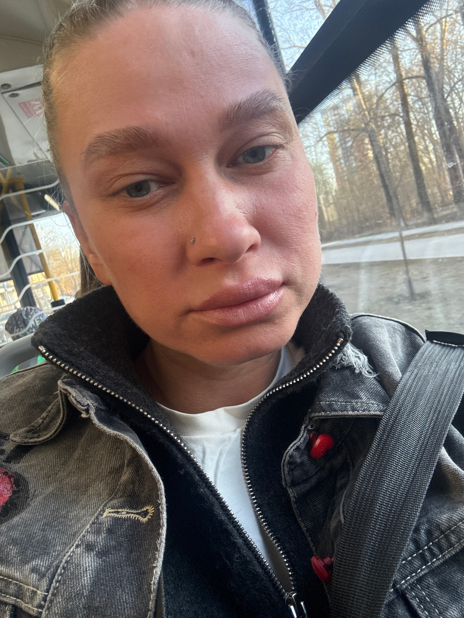 A close-up, selfie-style image captures a person with light skin, short, light-colored hair, and blue eyes. The person is wearing a white shirt under a faded black denim jacket with a visible zipper a…read more