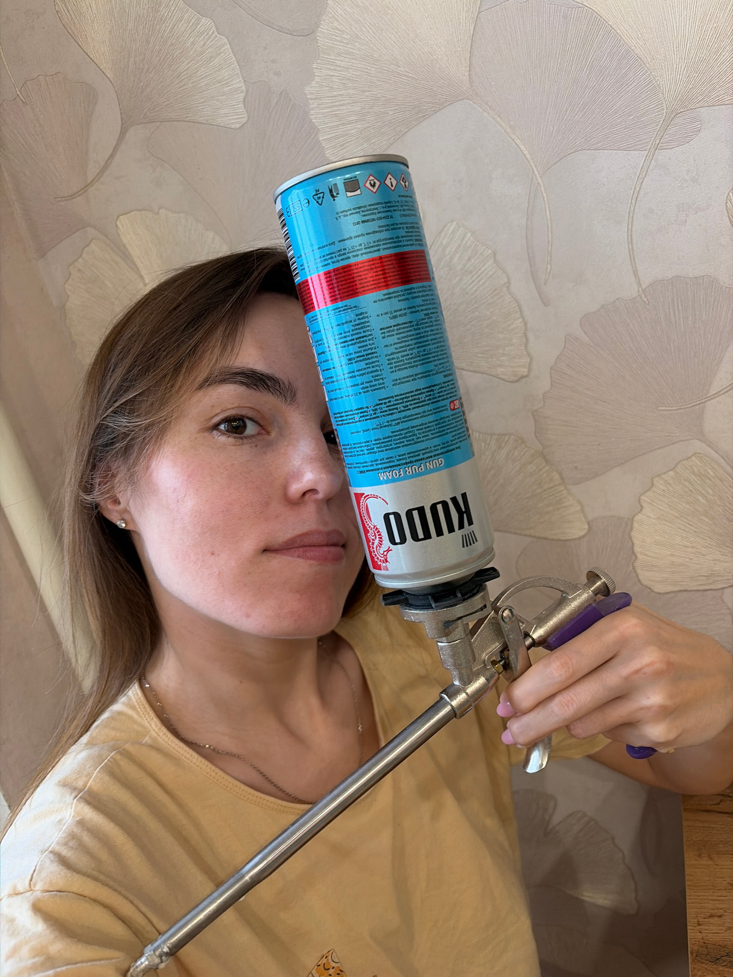 A woman lies on her back with a can of Kudo gun pur foam balanced on her forehead. A metal foam dispensing gun is attached to the can. The can is blue and silver with red stripes and Russian writing.…read more