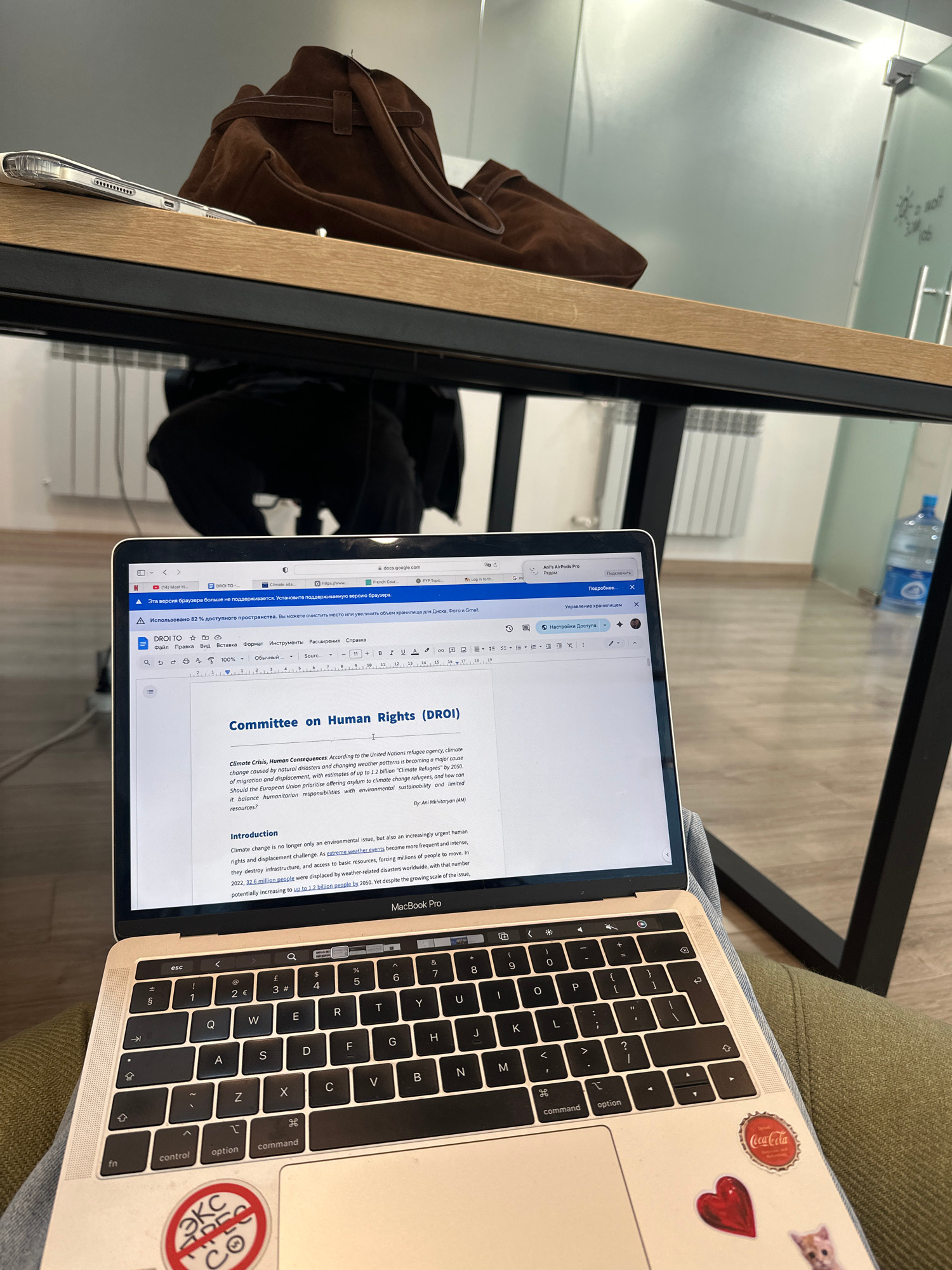 A laptop with a document on "Committee on Human Rights (DROI)" is open on a desk next to a bag. The laptop has stickers on it. The location is likely indoors, potentially in an office, but the specifi…read more