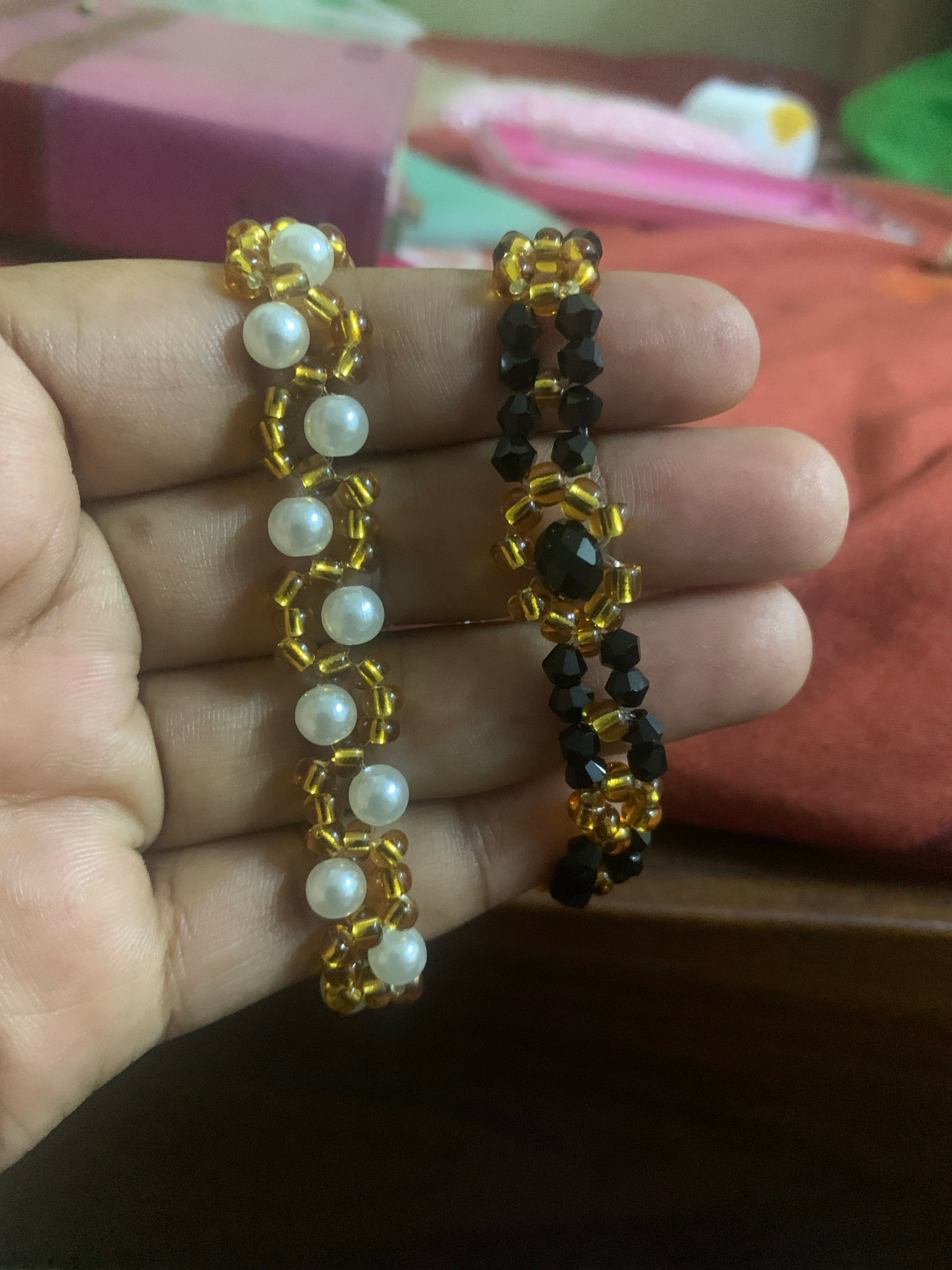 A hand displays two beaded rings. The top ring alternates gold and black beads, with a larger black bead at the center. The bottom ring features gold beads interspersed with white pearls. The backgrou…read more