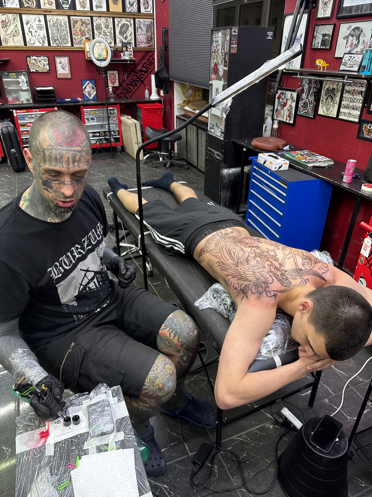 The image depicts a tattoo studio in Moscow, Russia. A heavily tattooed man, wearing a black t-shirt with a white design, black shorts, and black gloves is tattooing a younger man lying on a tattoo be…read more