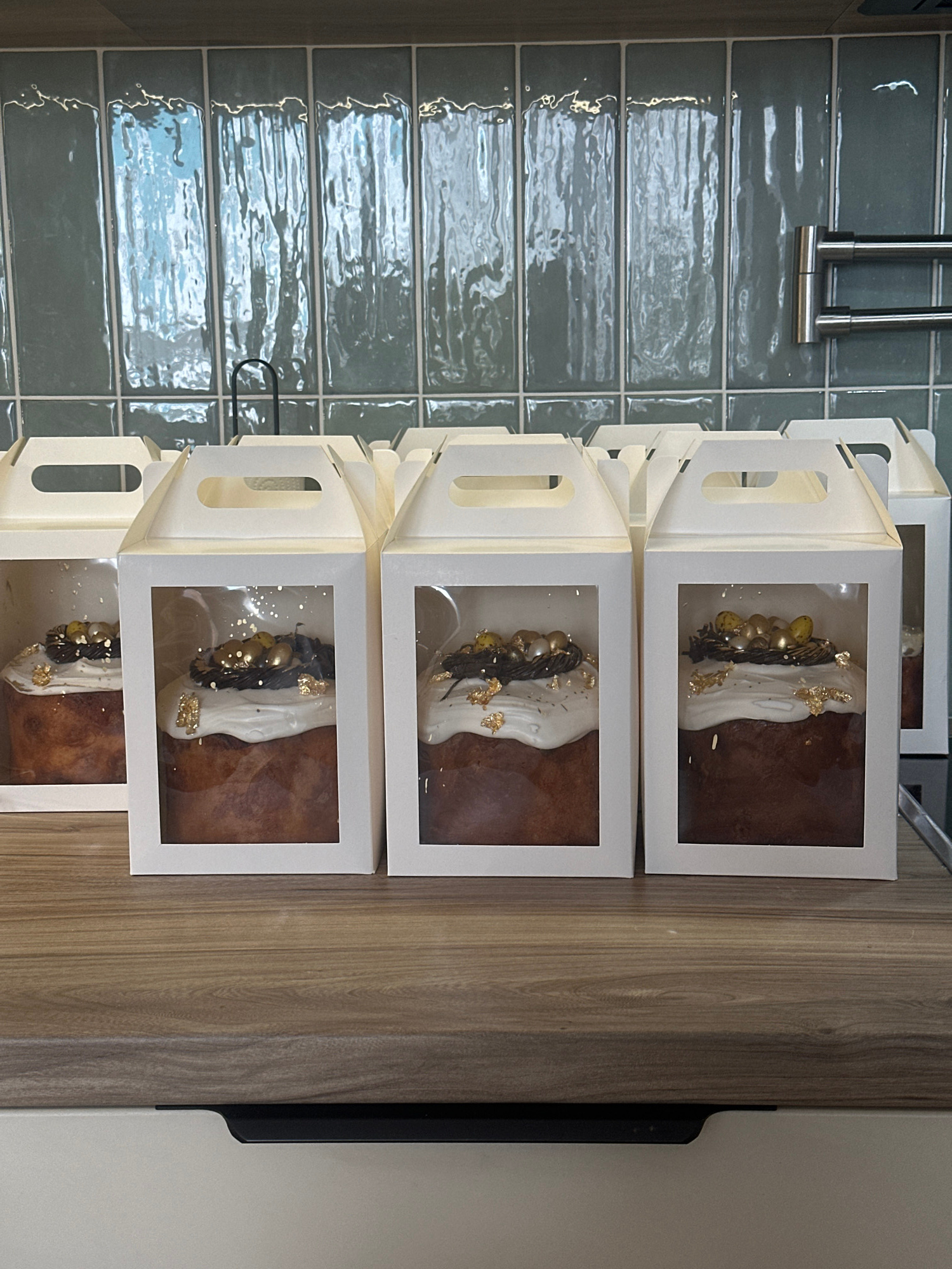 A close-up, medium-shot photograph displays a stack of four packaged cakes placed on a countertop. The cakes are in white boxes with transparent windows, revealing ornate frosting decorations with gol…read more
