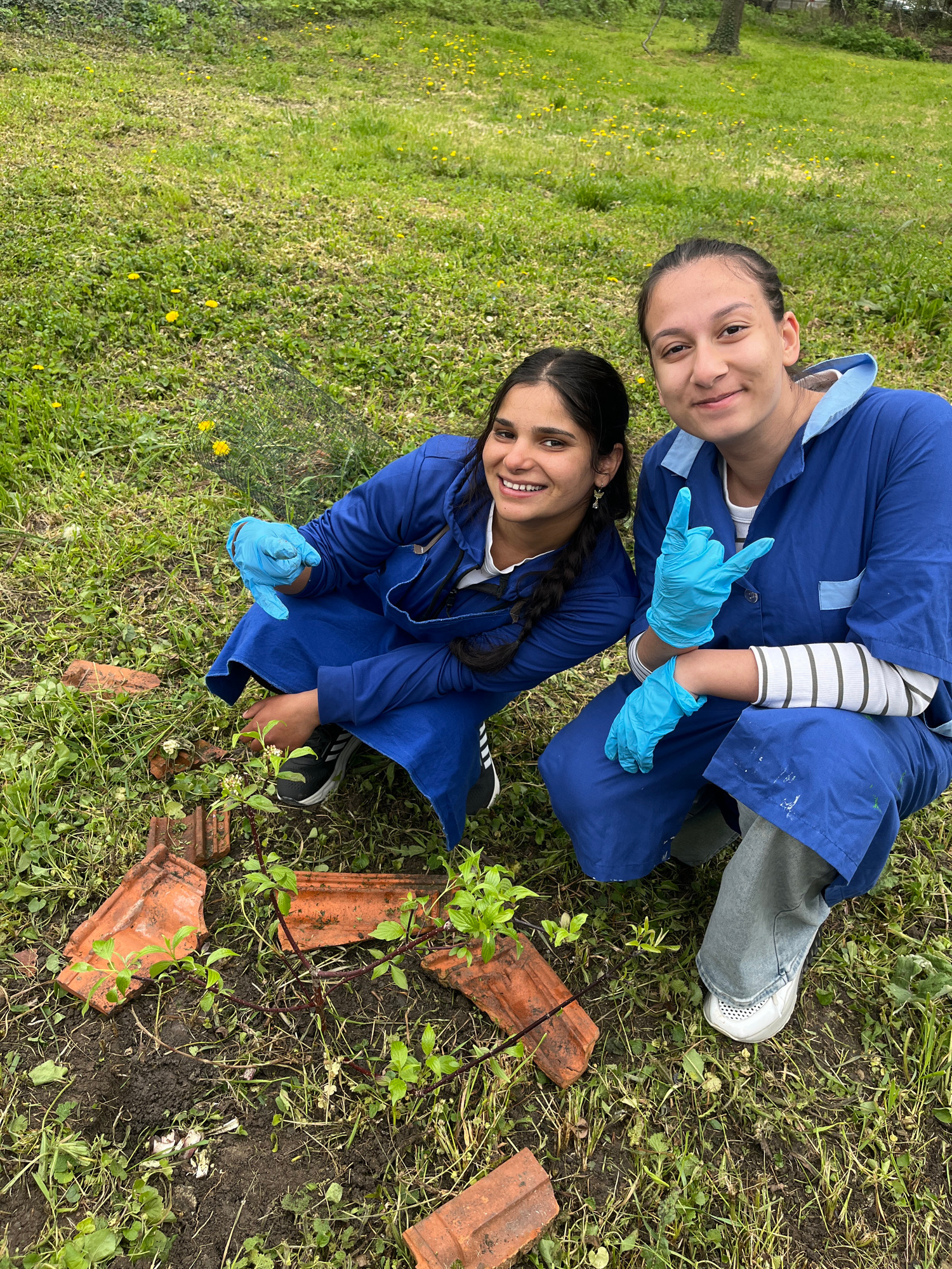 Two young women, dressed in blue protective overalls and light blue gloves, are kneeling or crouching outdoors on a grassy patch of ground in Karnobat, Bulgaria. Both are smiling brightly at the camer…read more