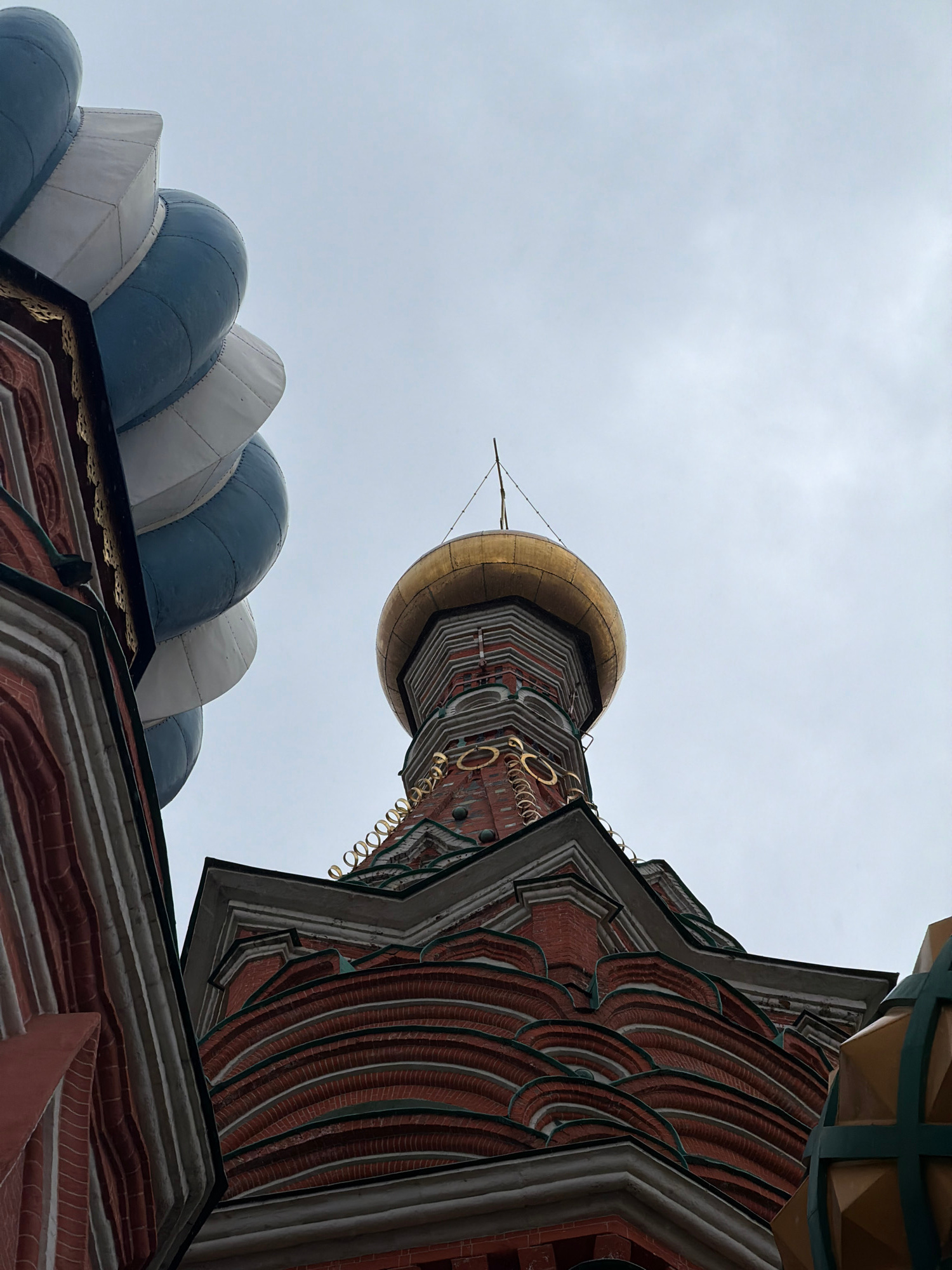 This image presents a low-angle, upward view of the ornate architectural elements of a cathedral, likely St. Basil's Cathedral in Moscow, Russia, against a uniformly overcast, light grey sky, indicatiβ¦read more
