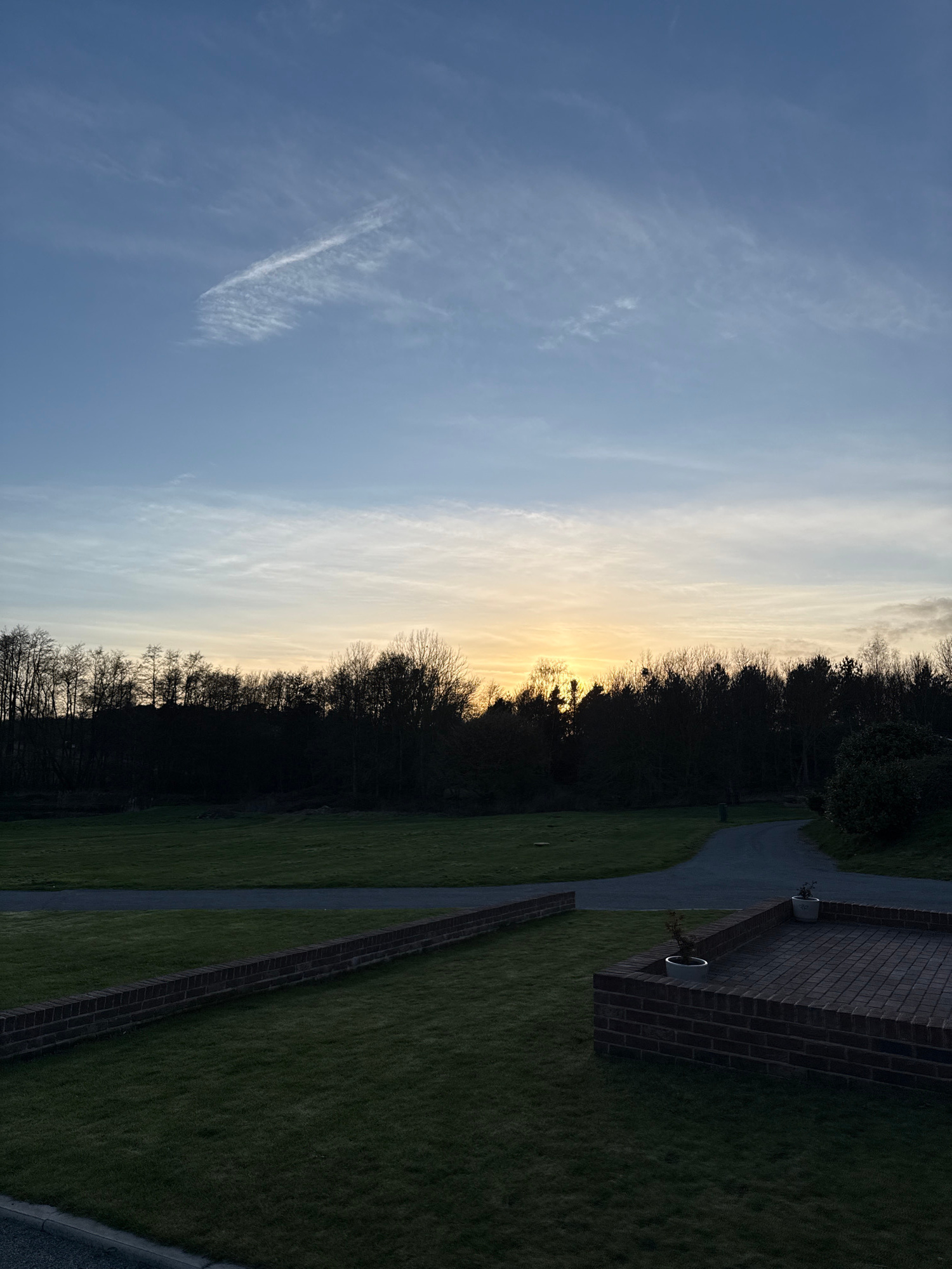 The image shows a landscape oriented scene. The left portion of the image depicts a blue sky with some white clouds. The middle ground shows a line of trees silhouetted against a bright, possibly suns…read more