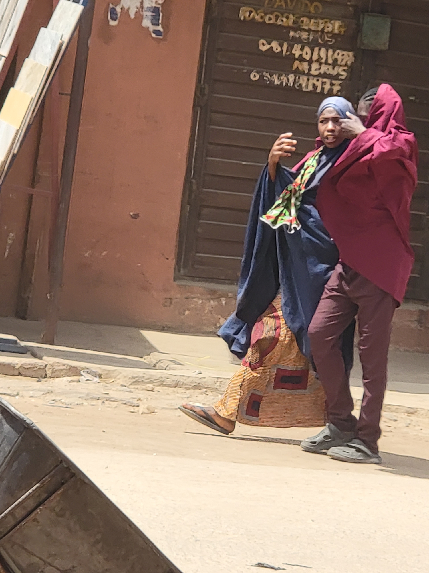 On a street in Maiburiji, Nigeria, two people stand on a sidewalk next to a building with a closed, metal shutter door on which text and numbers are painted. The person closest to the building wears a…read more